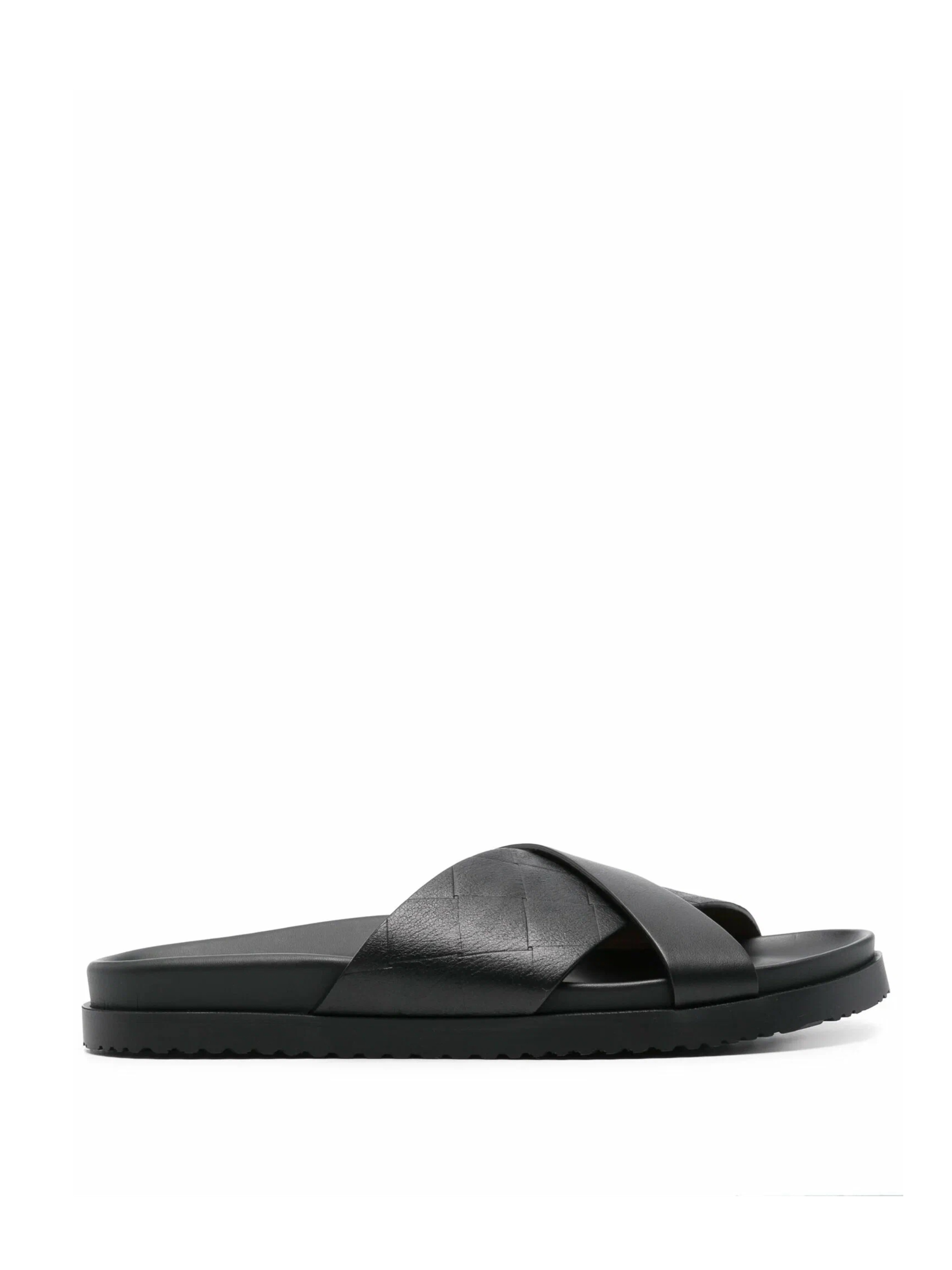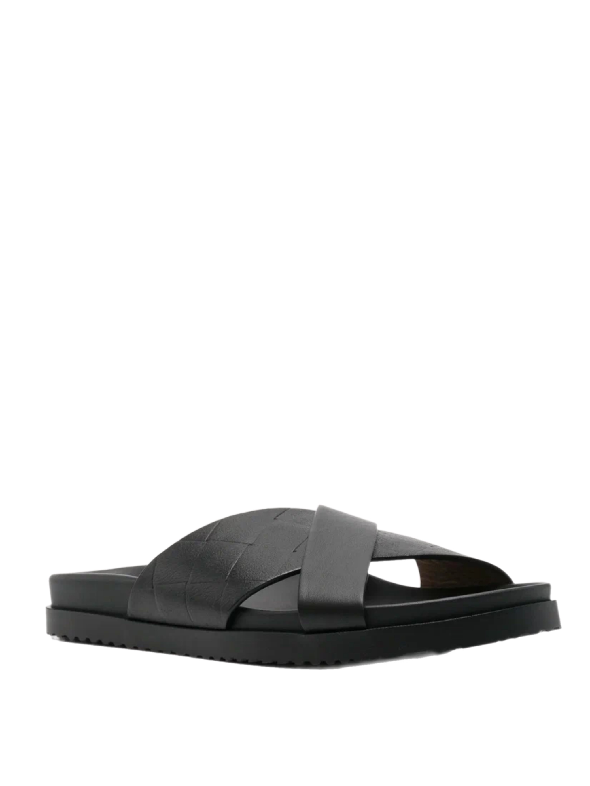 Мужские сандалии из благородной текстурированной телячьей кожи в черном цвете — ключевая модель летнего сезона. Два скрещенных ремешка охватывают ногу, формируя сдержанный и современный силуэт, а ультралегкая резиновая подошва придает комфорт каждому шагу. Конструкция Cemented: надежная и устойчивая подошва приклеена с использованием экологичных клеевых составов высокой прочности для обеспечения долговечного и экологически ответственного комфорта. Модель полностью изготовлена в Италии.
