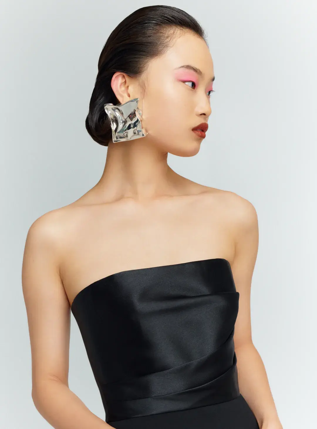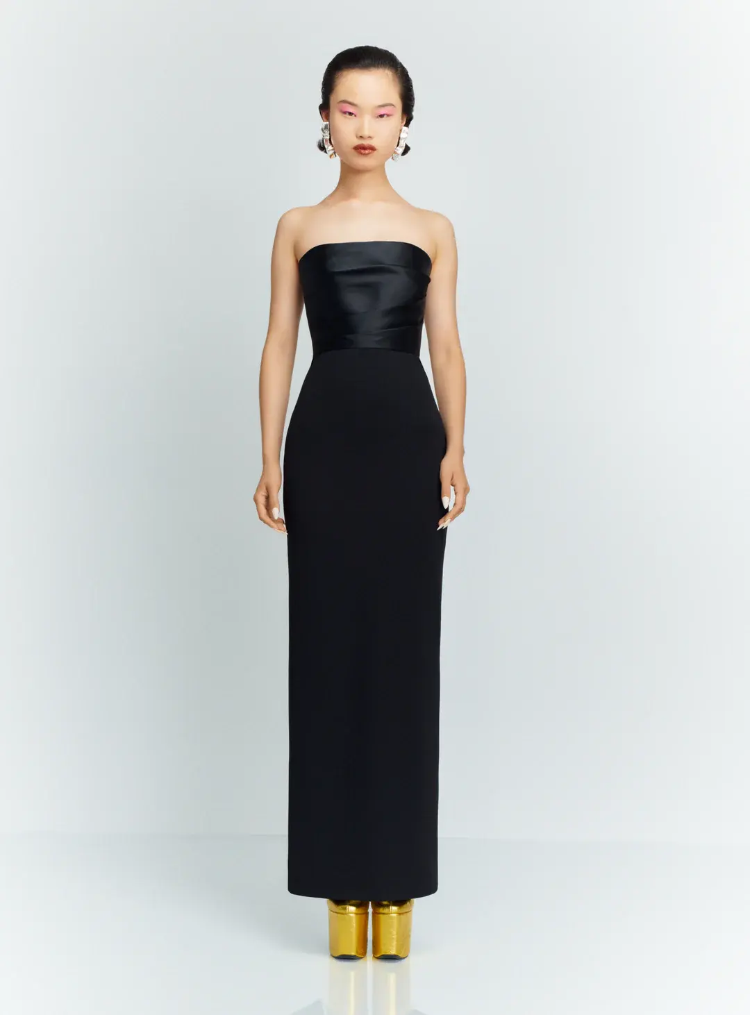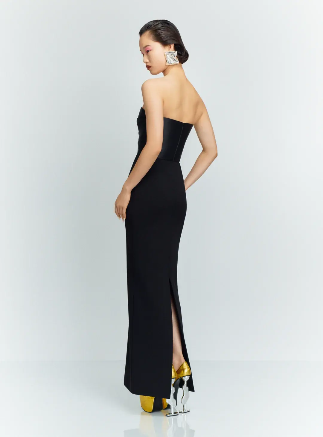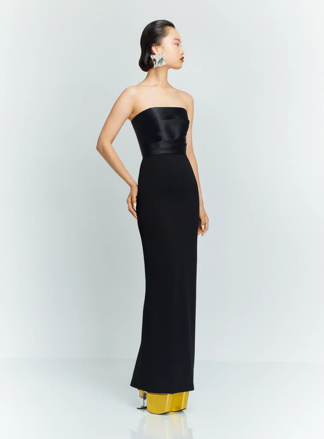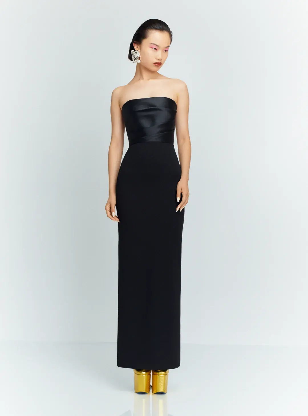 Платье Solace London "Afra" действительно вне времени. Он сделан из крепа для фигурной посадки и имеет собранный лиф из атласа. Дополните вырез без бретелек сверкающим колье.