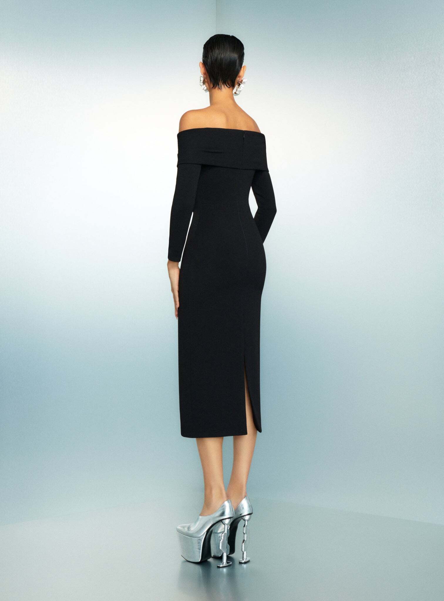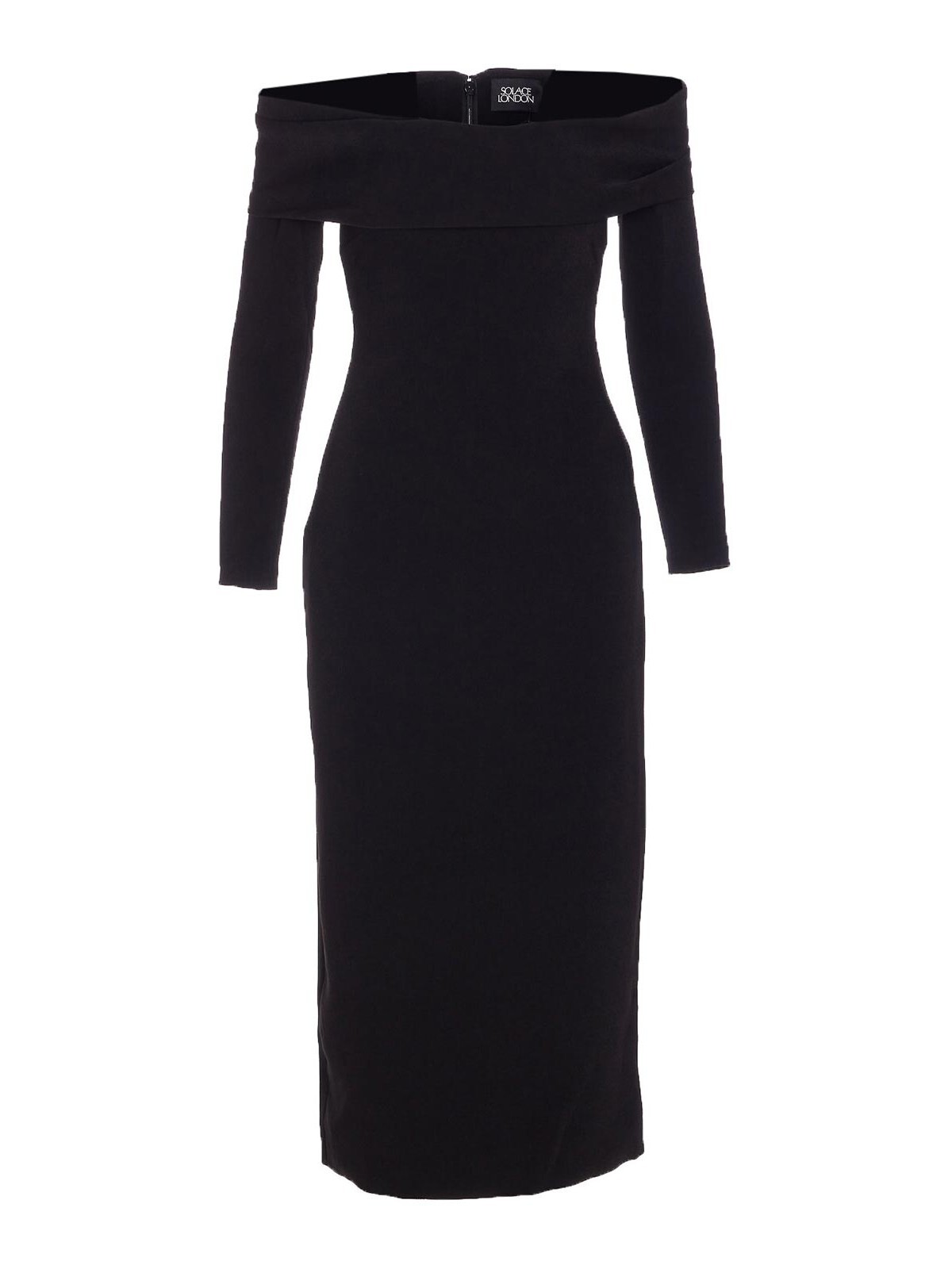 Платье миди с открытыми плечами Yuni. Выполненный из эластичного полиэстера черного цвета, элегантно облегающего по фигуре.