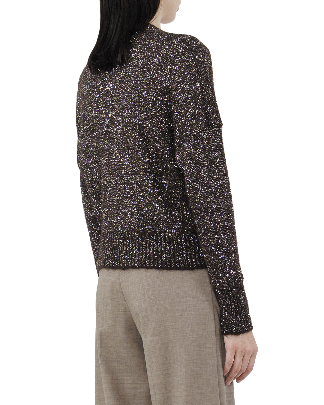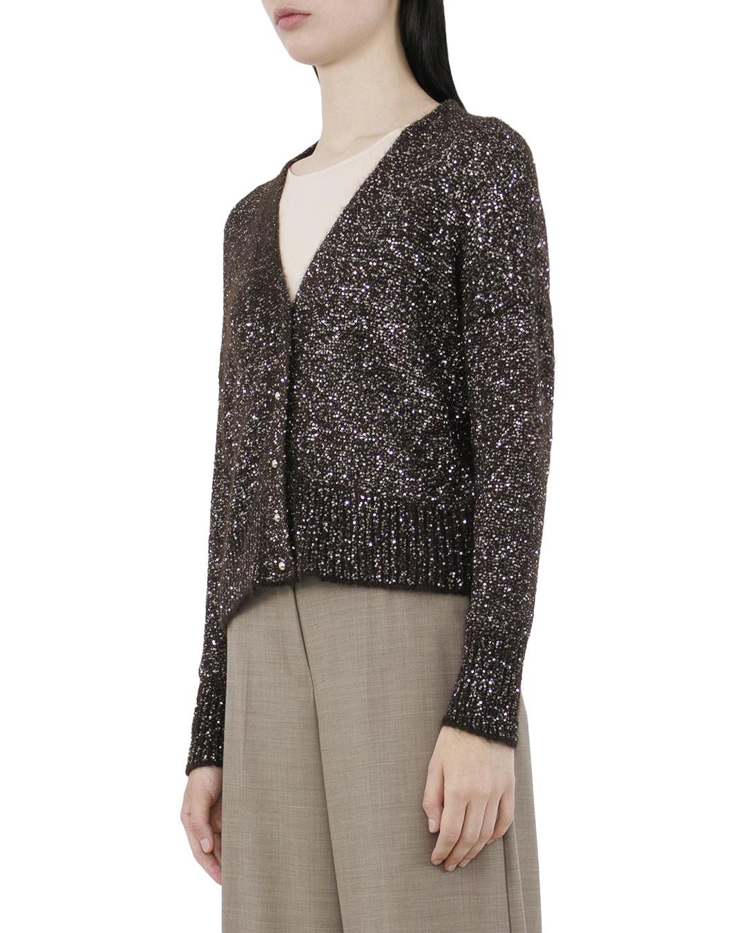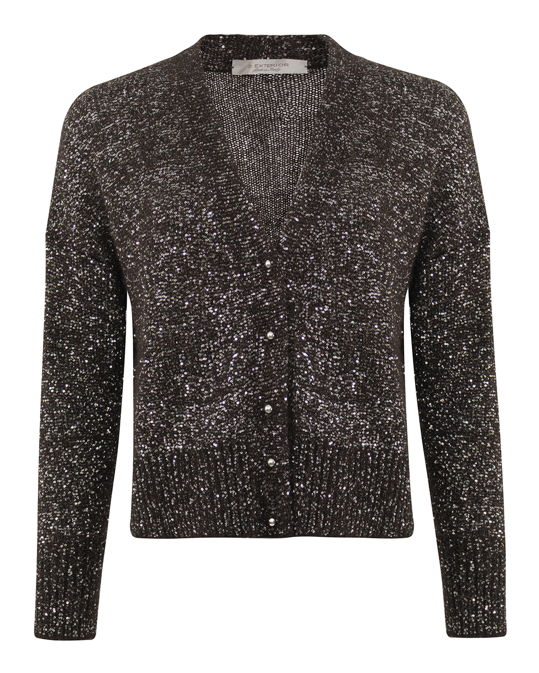 Этот кардиган — воплощение блестящего шарма и изысканной роскоши. Темный оттенок, усыпанный мерцающими пайетками, создаёт эффект звездного неба, привнося в образ загадочную элегантность. Утончённый V-образный вырез формирует стильную линию декольте, идеально подходящую для многослойности. Застёжка на изящные пуговицы с металлическим блеском создает гармоничный акцент, подчёркивая блеск ткани. Этот кардиган прекрасно подходит для вечерних выходов и особых событий, легко сочетаясь как с элегантными платьями, так и с классическими комплектами. Он добавляет нотку гламура и изысканности в любой образ, делая его по-настоящему незабываемым.