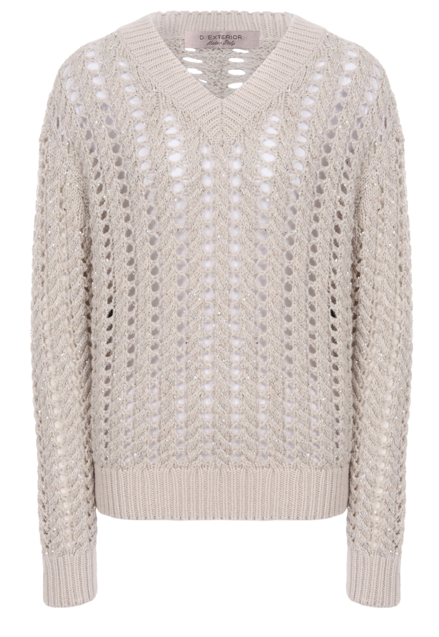 Свитер со спущенной линией плеч выполнили из шерстяной пряжи с добавлением кашемира, вискозы, шелка и пайеток. Связанную полупрозрачным узором модель дополнили поясом, манжетами и V-образной горловиной в рубчик.