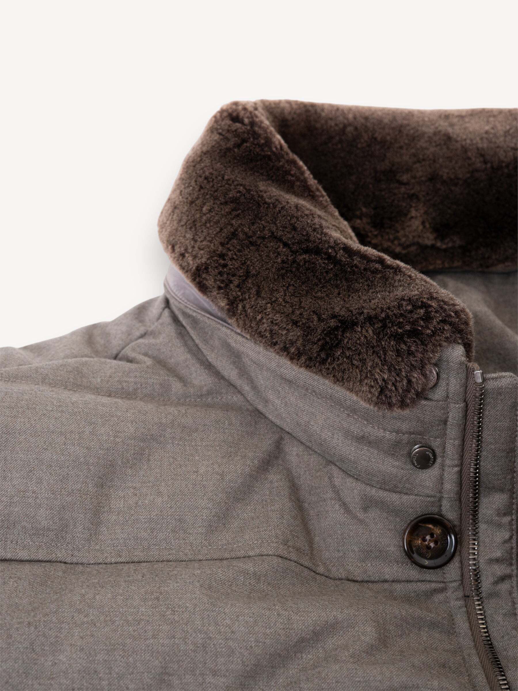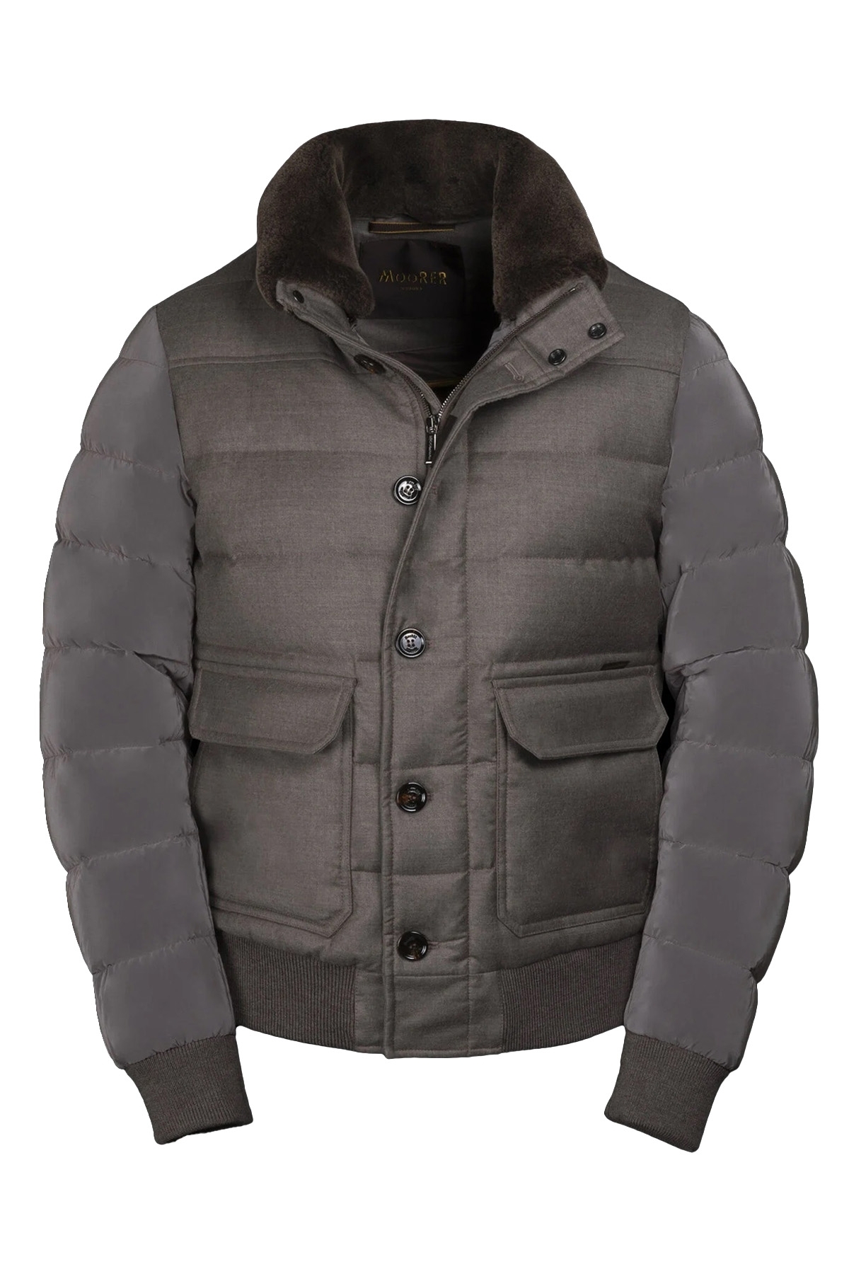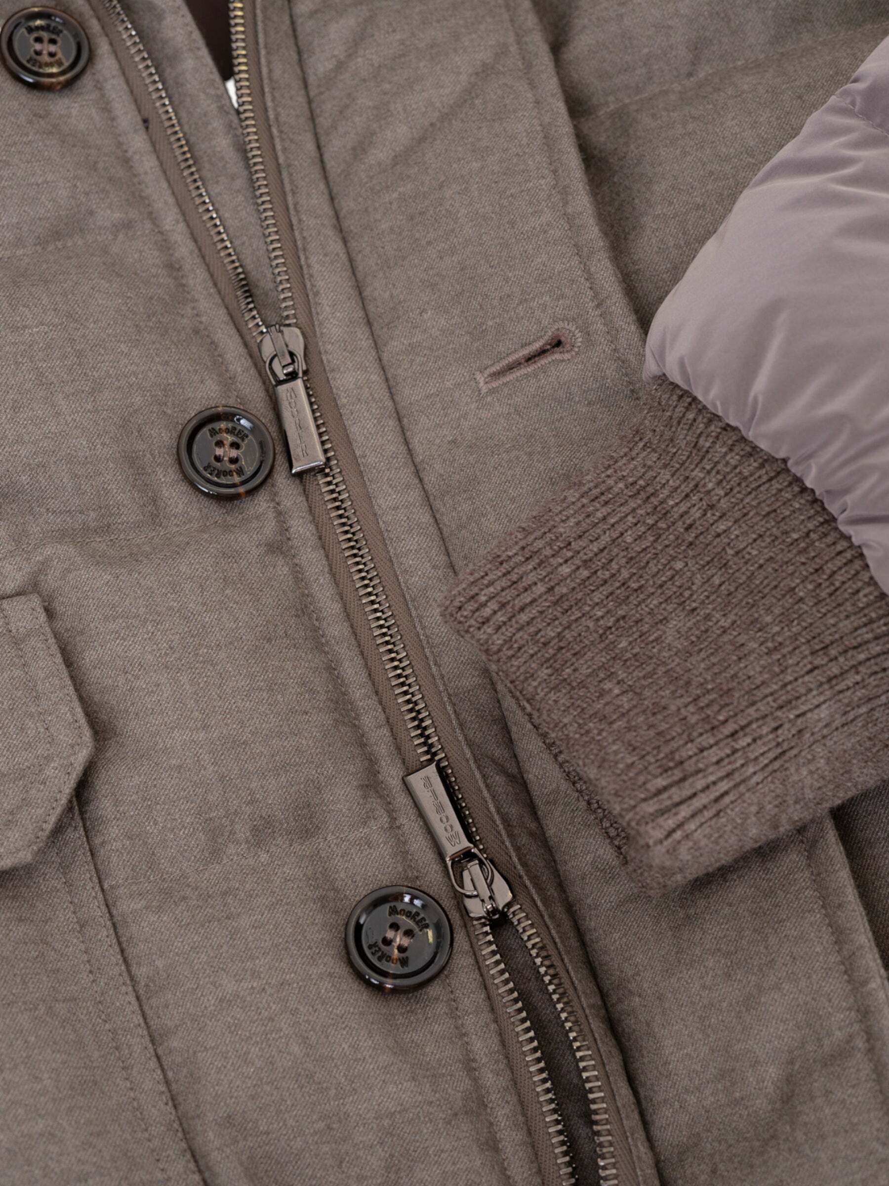 Куртка-бомбером из гусиного пуха и стеганым верхом. Изготовлен из смеси материалов: пухостойкая техническая микрофибра в сочетании с фланелевой смесью шерсти/кашмира. Съемный воротник из овчины. Двойная передняя застежка с двухсторонней молнией из матового металла и застежка на пуговицах с роговыми пуговицами. Накладные карманы с клапанами с двойной боковой вставкой на бедрах.