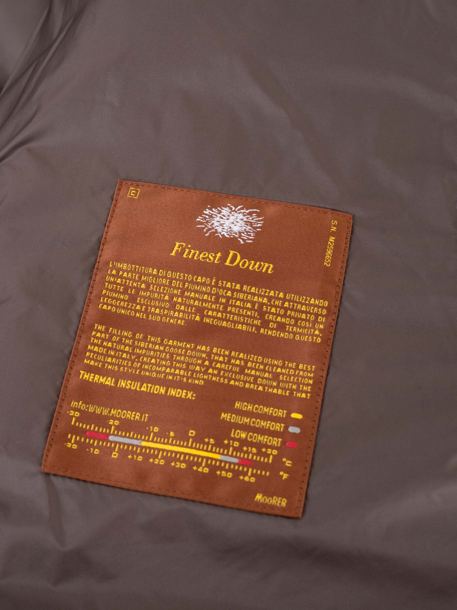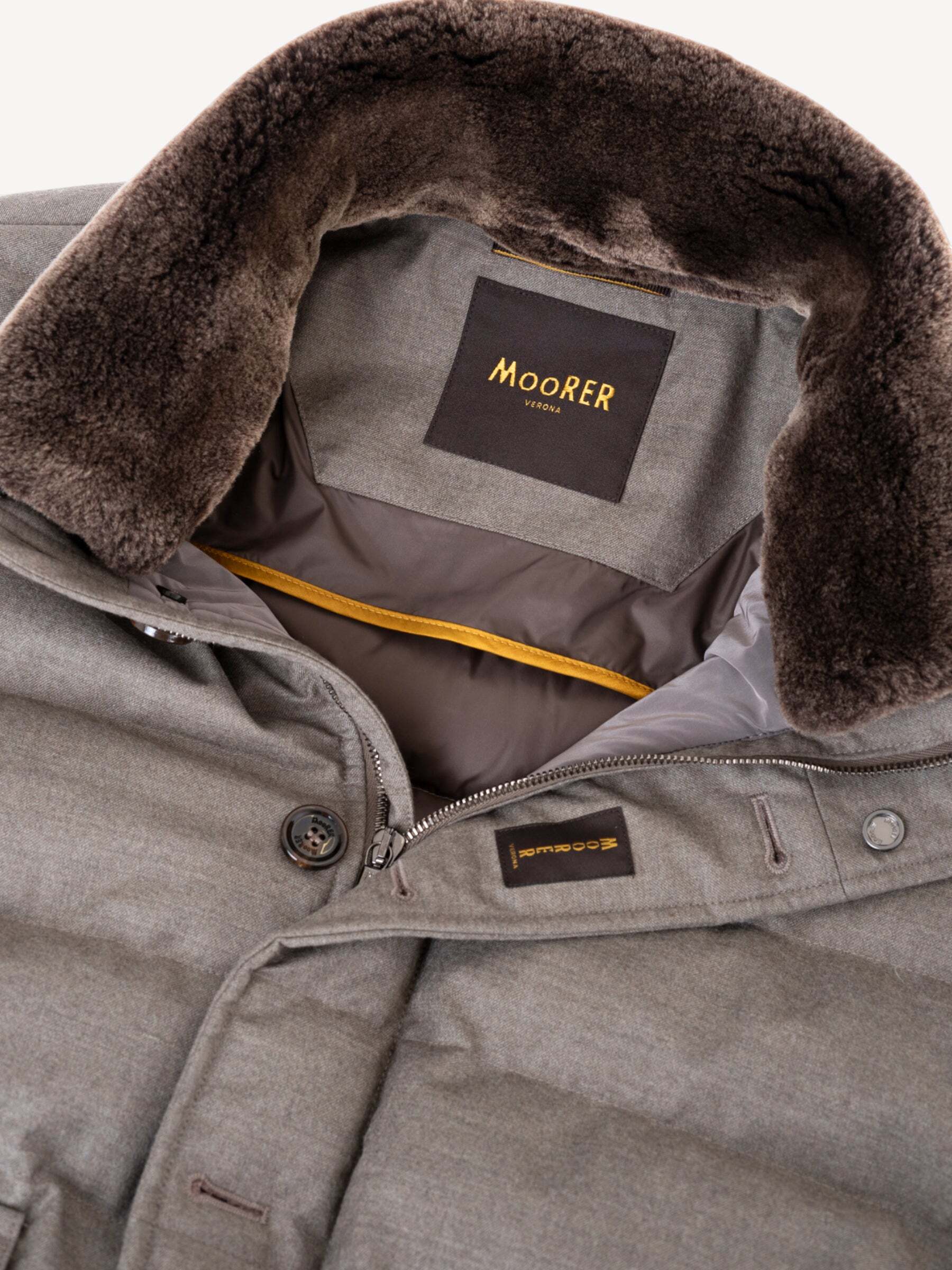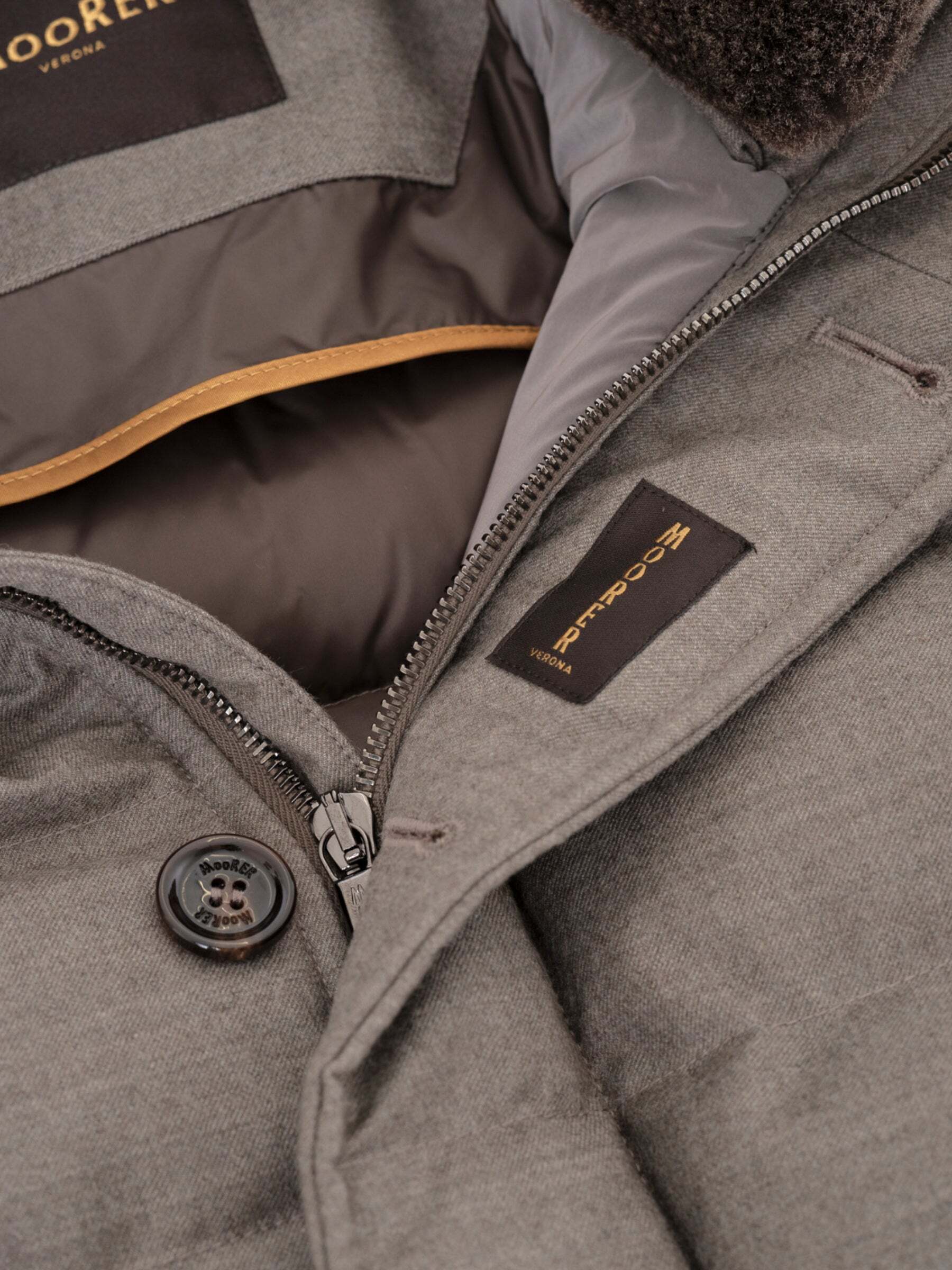 Куртка-бомбером из гусиного пуха и стеганым верхом. Изготовлен из смеси материалов: пухостойкая техническая микрофибра в сочетании с фланелевой смесью шерсти/кашмира. Съемный воротник из овчины. Двойная передняя застежка с двухсторонней молнией из матового металла и застежка на пуговицах с роговыми пуговицами. Накладные карманы с клапанами с двойной боковой вставкой на бедрах.