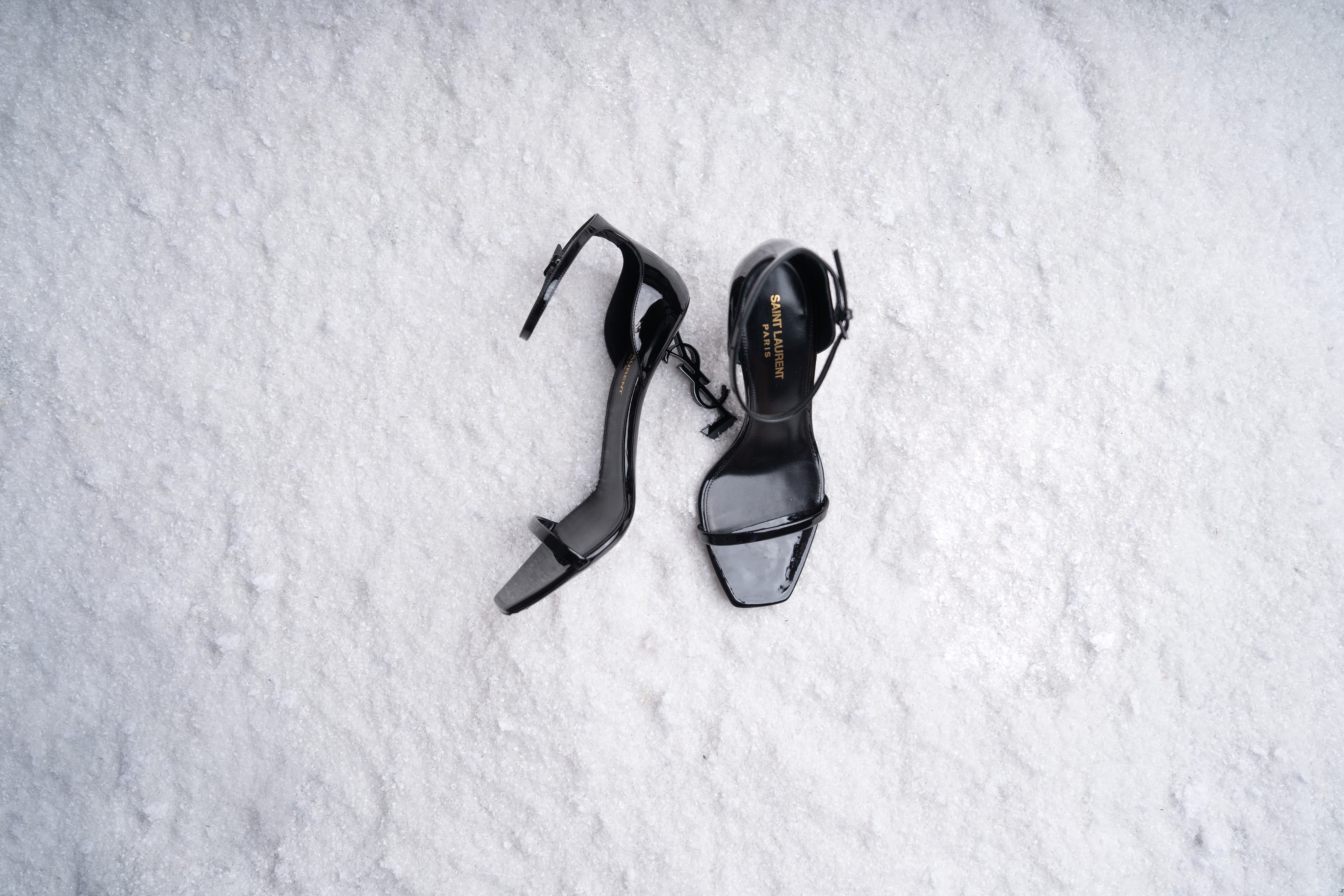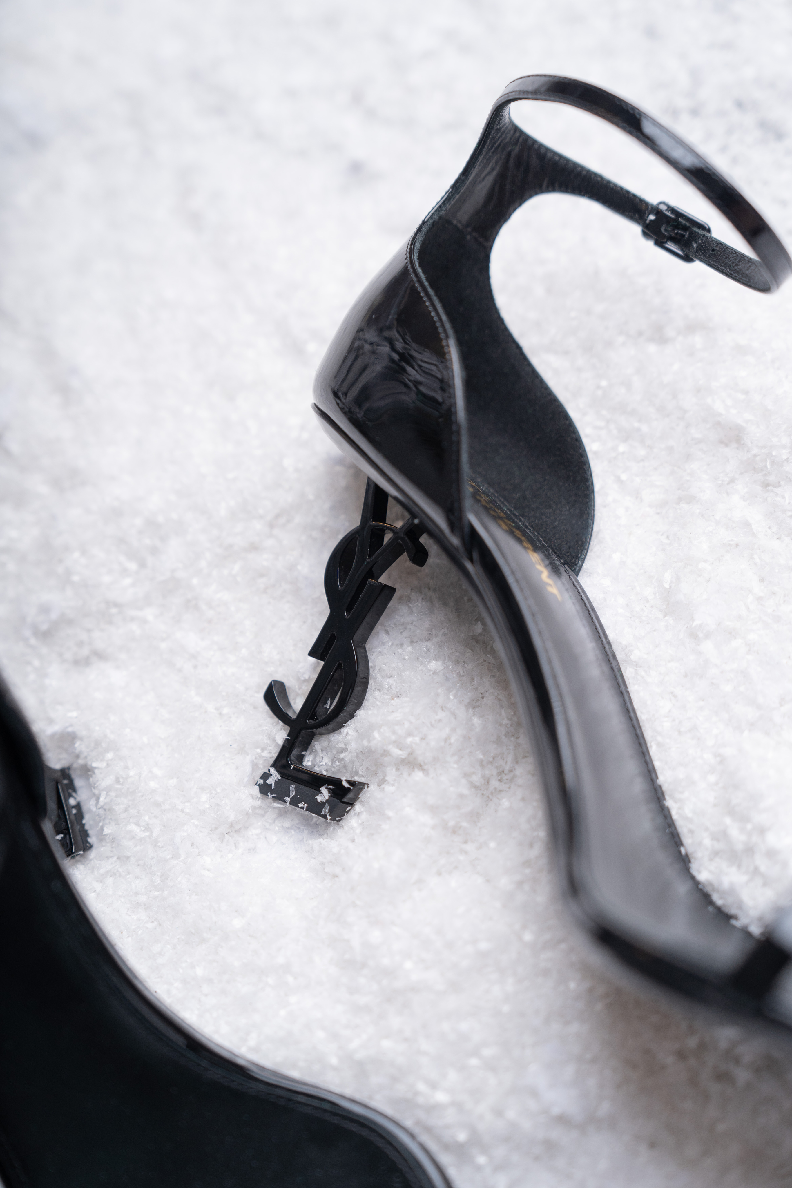 Черные босоножки Opyum 85 из лакированной кожи от Saint Laurent (Сен Лоран). Открытый носок, стелька с логотипом, ремешок на щиколотке и пряжка сбоку, скульптурный каблук в форме логотипа YSL.