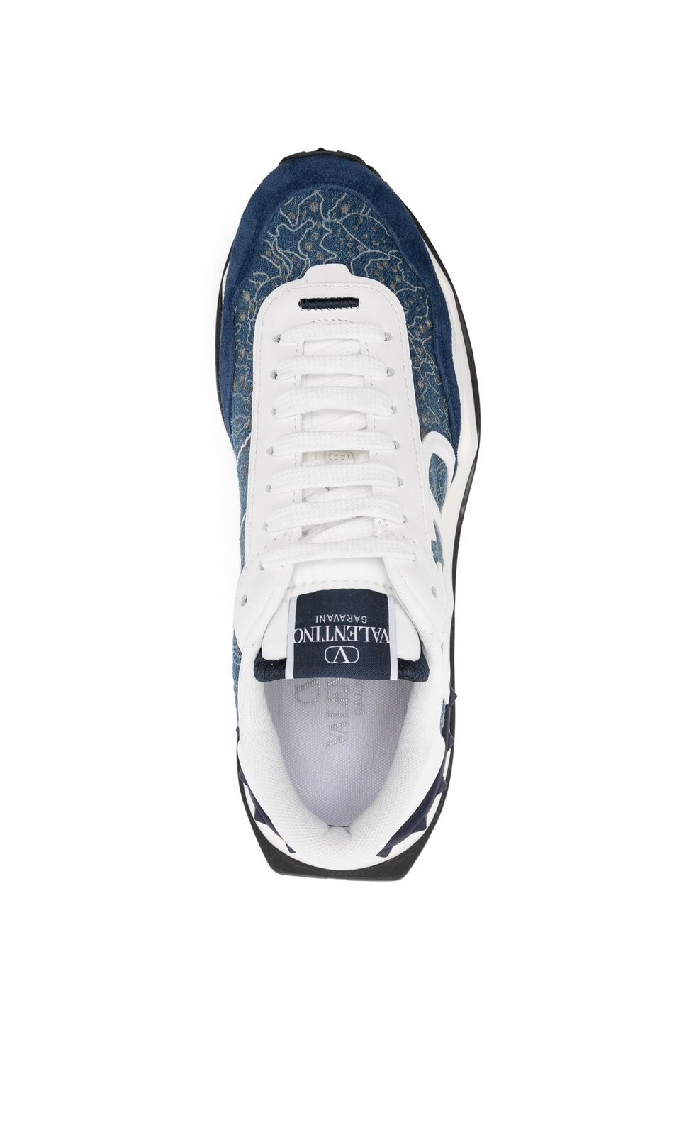 Кроссовки LACERUNNER комбинированные из денима, замши и кожи. В кроссовках Пьерпаоло Пиччоли искусно соединил динамику спортивной обуви с женственностью, демонстрирующей характерную для бренда эстетику. Изделие сбоку декорировали крупными аппликациями в виде символа VLogo. Впервые Валентино Гаравани украсил им изделия марки в 1970-х.