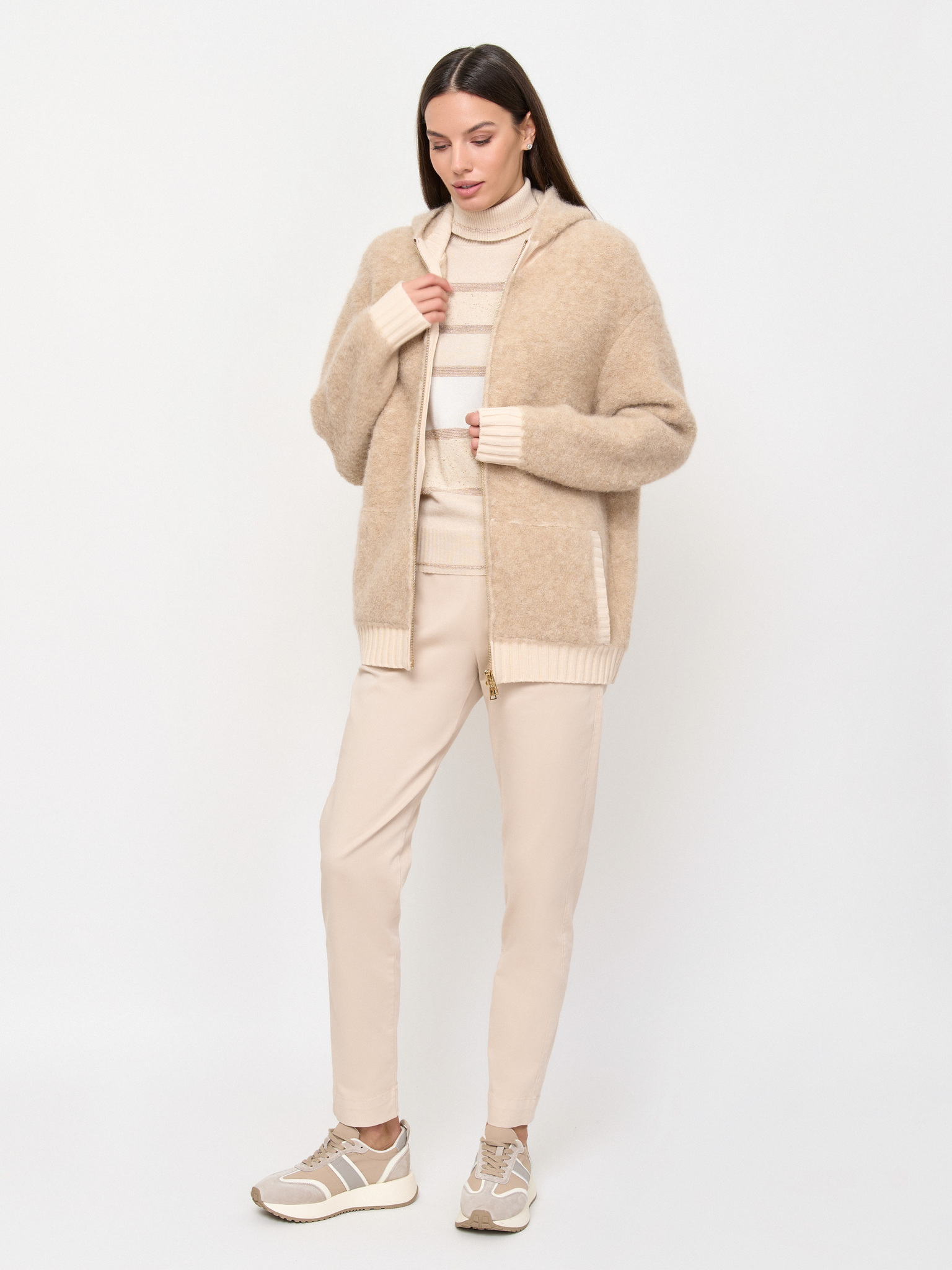 Напоминающий толстовку с капюшоном кардиган с рифленой отделкой выполнили из ворсистой шерстяной пряжи, усиленной полиамидом. Модель с накладными карманами застегивается скрытой встречной молнией с брендированными пуллерами.