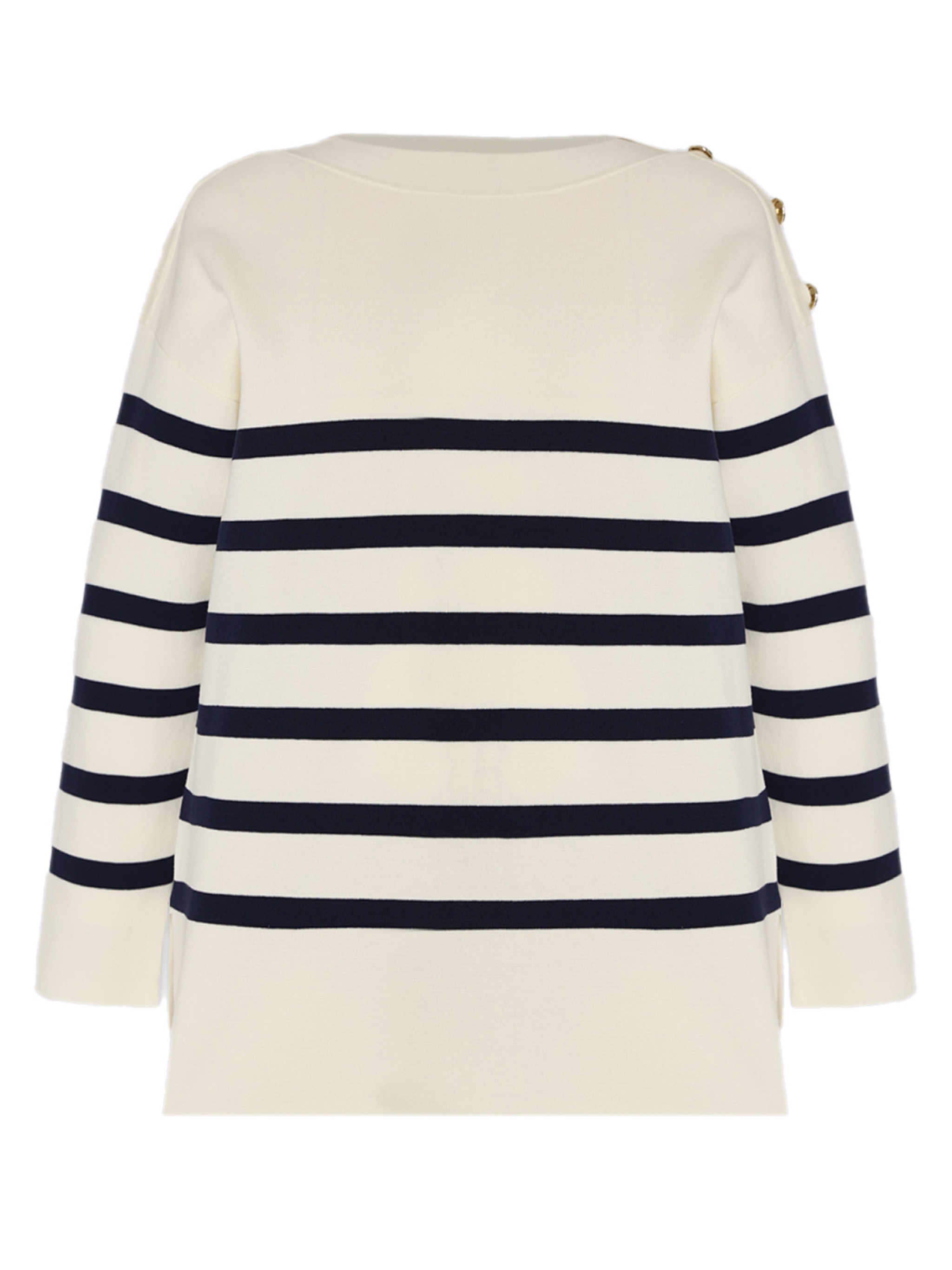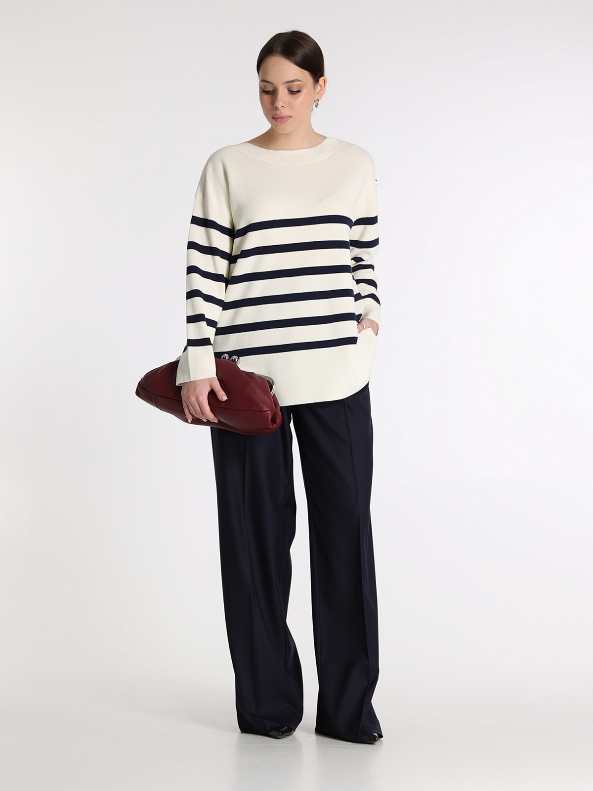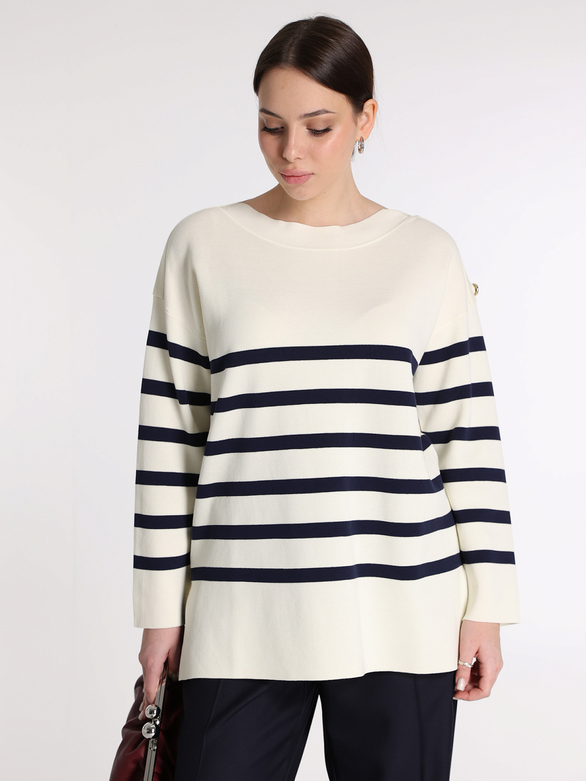 Джемпер Marina Rinaldi, белый с синими полосами, создает классический и элегантный образ. Состав 50% хлопка и 50% модала обеспечивает мягкость и комфорт. Фактура ткани легкая и текстурированная, придающая джемперу изысканный вид. Стильный крой и округлая горловина подчеркивают лаконичность и современность модели. Джемпер актуален в трендовом сезоне осень-зима, его отделка золотистыми пуговицами добавляет детализированной нотки.