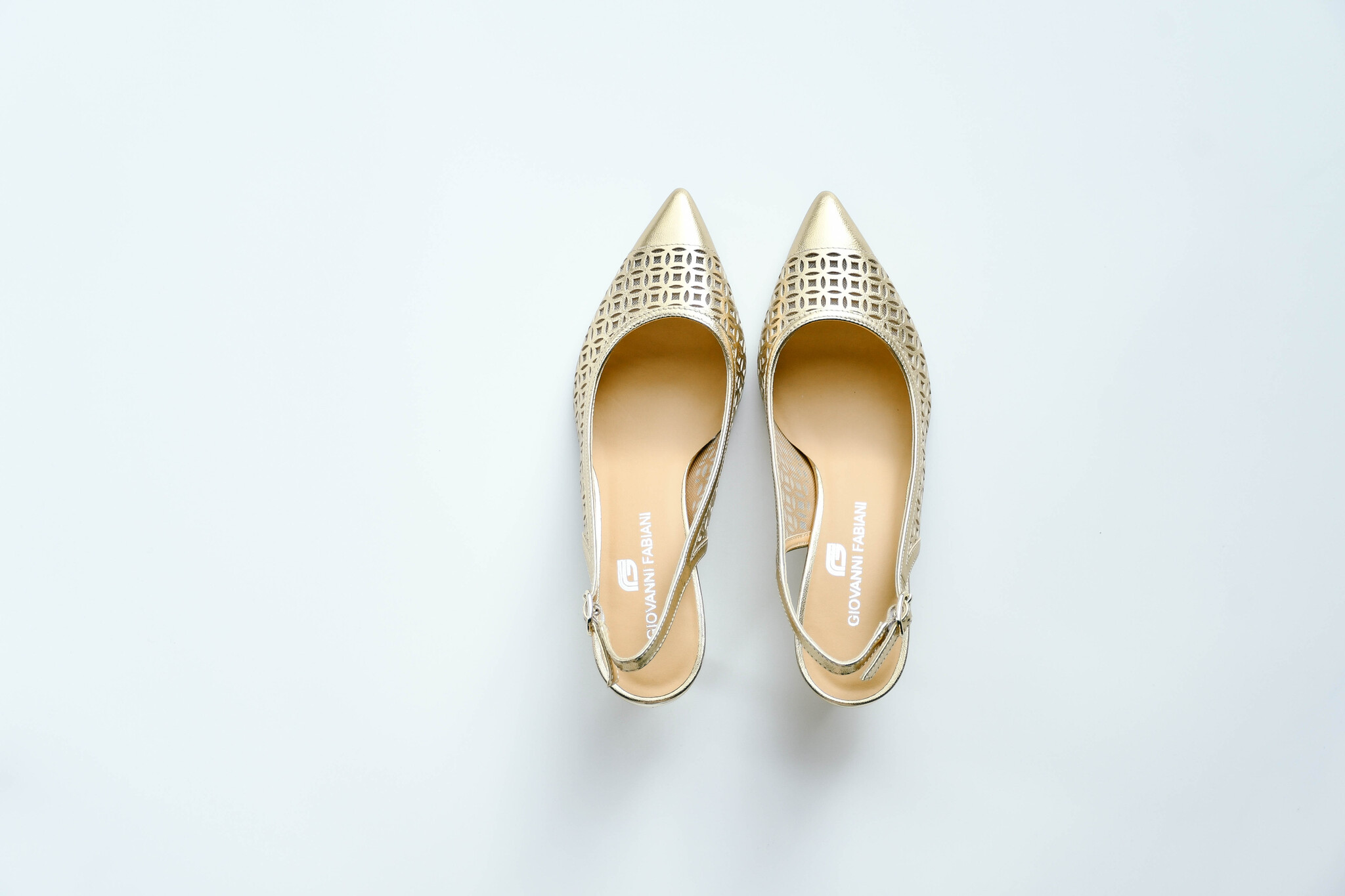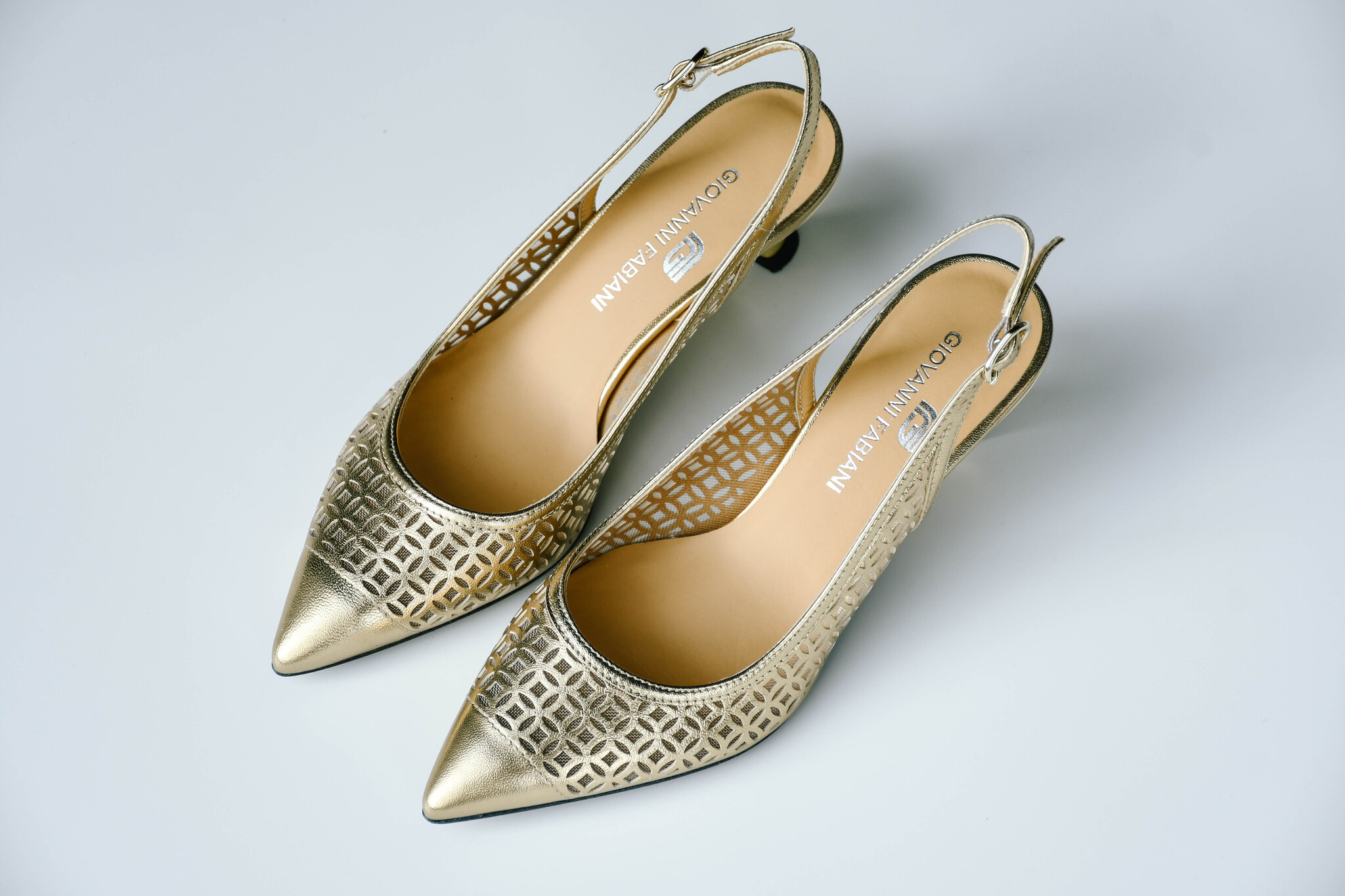 Золотые босоножки на небольшом каблуке с открытой пяткой.