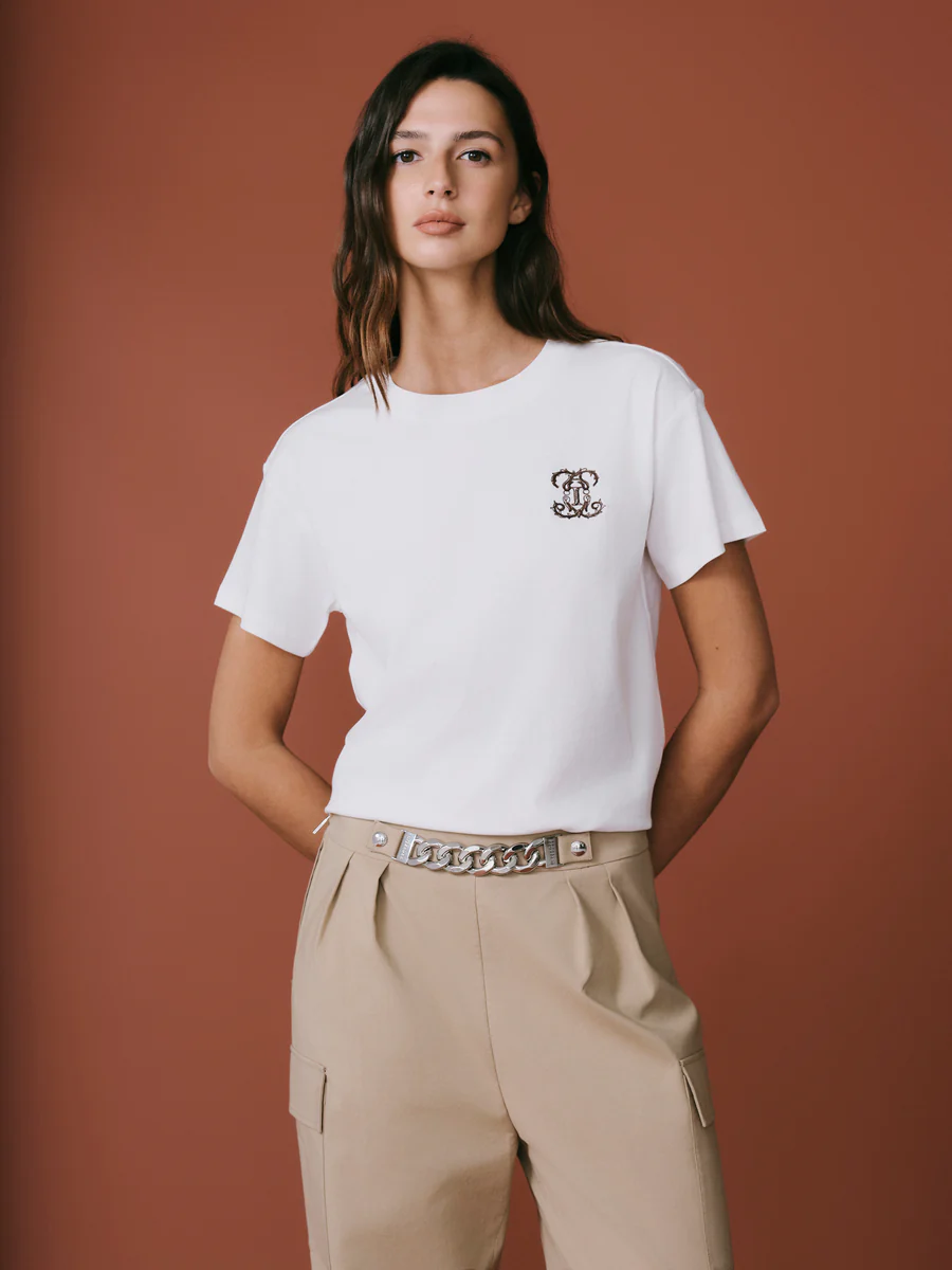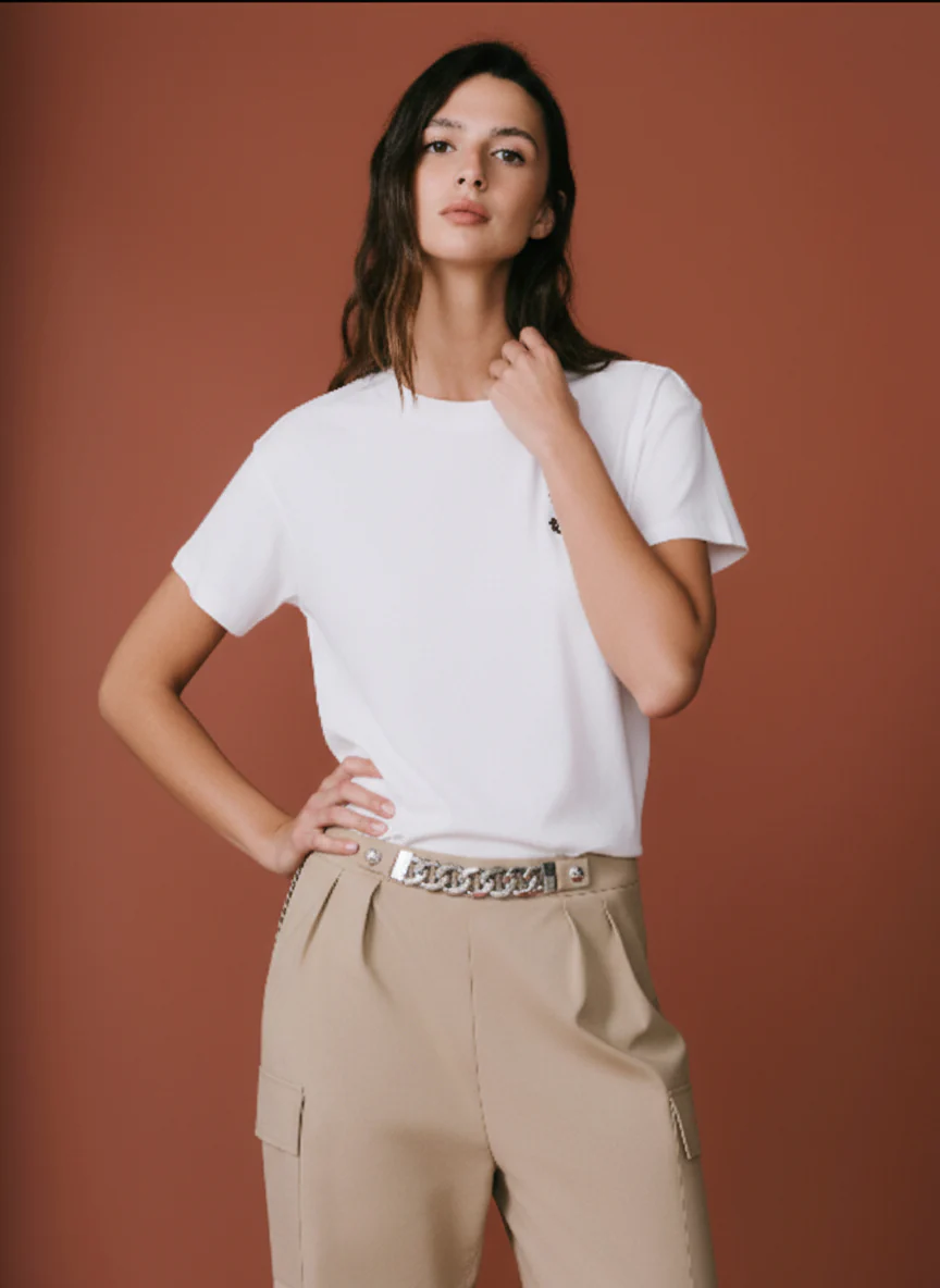 Футболка с коротким рукавом и вышивкой на груди, естественно, интегрирована в современный гардероб, идеально подходит для ношения отдельно или в сочетании с различными предметами для стиля, который одновременно трезвый и аккуратный.