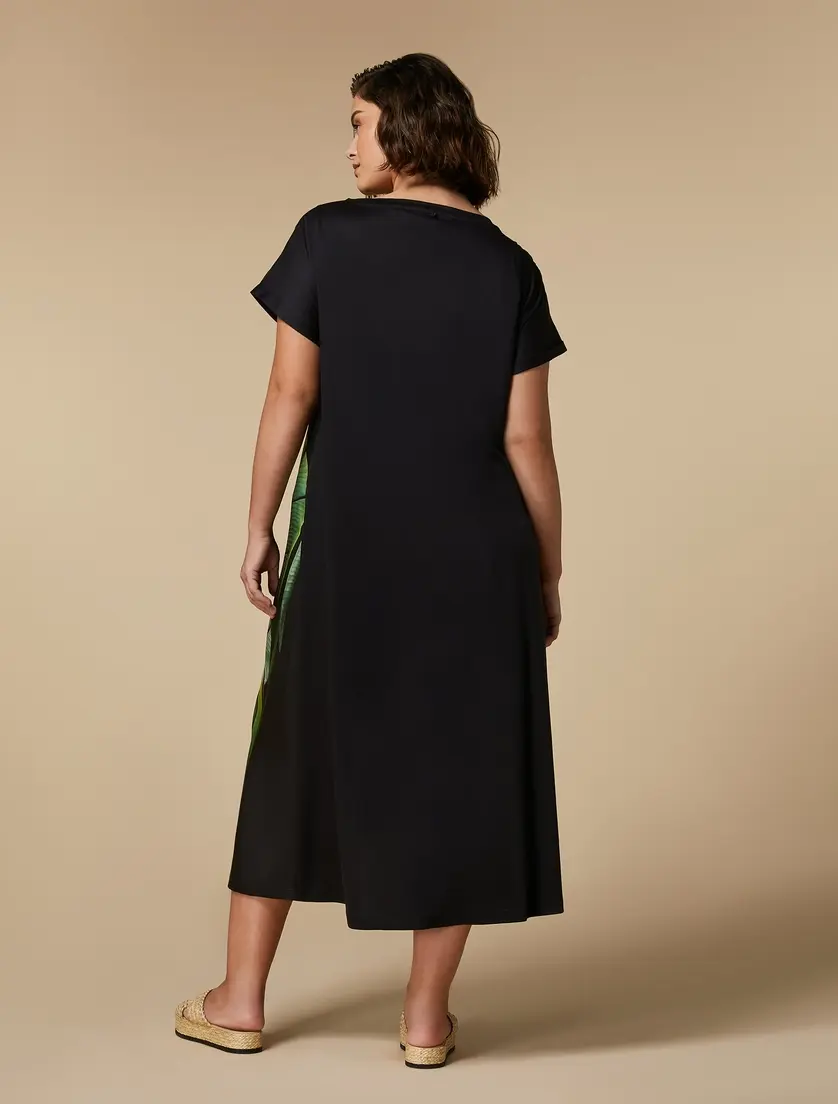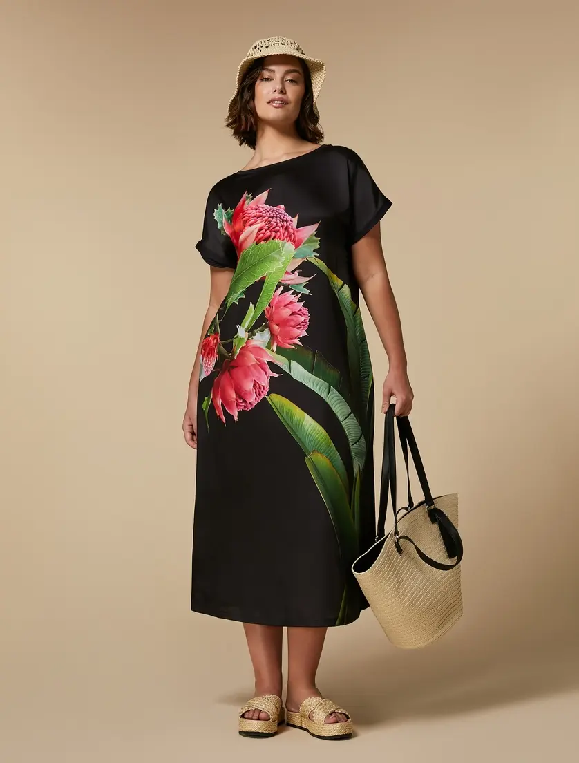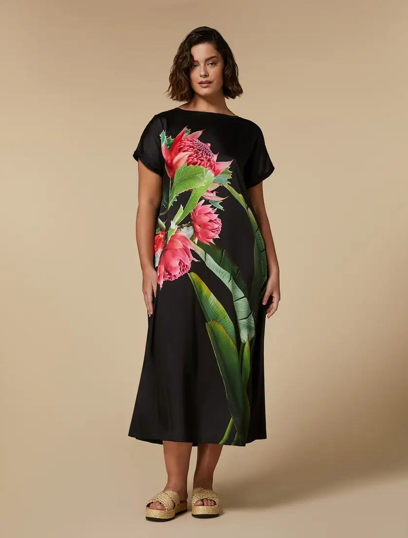 Хлопковое поплиновое платье черного цвета CADINE с эксклюзивным принтом - яркий цветок, свободная и прямая модель платья. Сшито из двух материалов: полиэстера и хлопка.