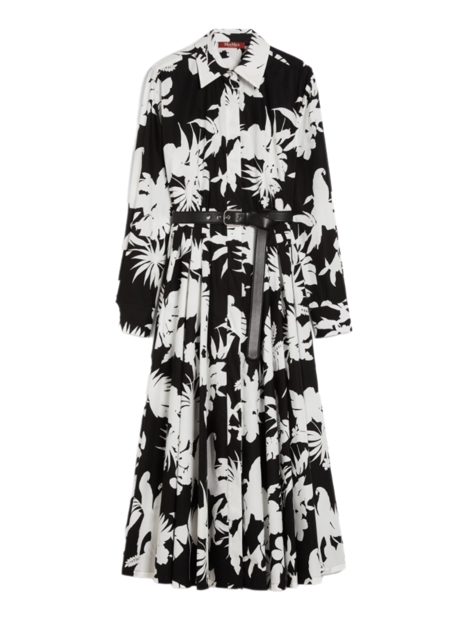Длинное платье-рубашка из мягкого поплина из чистого хлопка с принтом по всему телу. Стиль без подкладки с классическим воротником рубашки, встроенными боковыми карманами и длинными рукавами с манжетами на пуговицах. Имеет боковые разрезы на подоле и плиссированный узор спереди. Соответствующий пояс подчеркивает силуэт. Скрытая пуговица спереди.