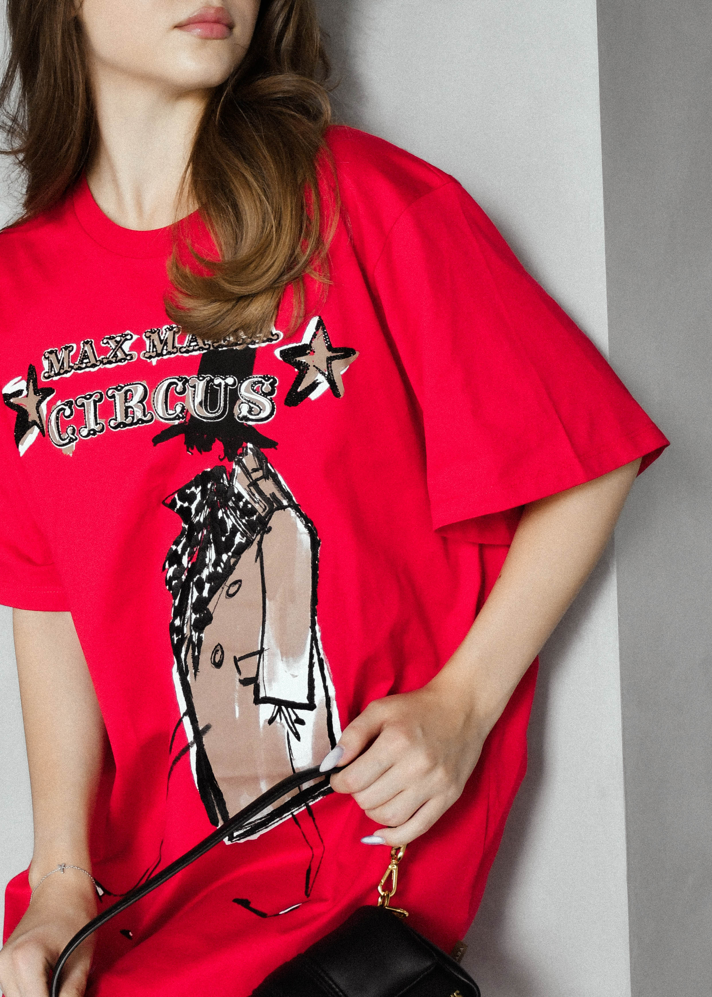 Ярко-красная женская футболка-оверсайз с персонализированным логотипом и принтом-портретом впереди — модель из лимитированной серии Max Mara, вдохновением которой стал миниатюрный цирк Александра Колдера "Cirque Calder”. Этот красочный экземпляр создан, чтобы притягивать внимание. Носите с юбками и брюками, шортами и джинсами на контрасте.