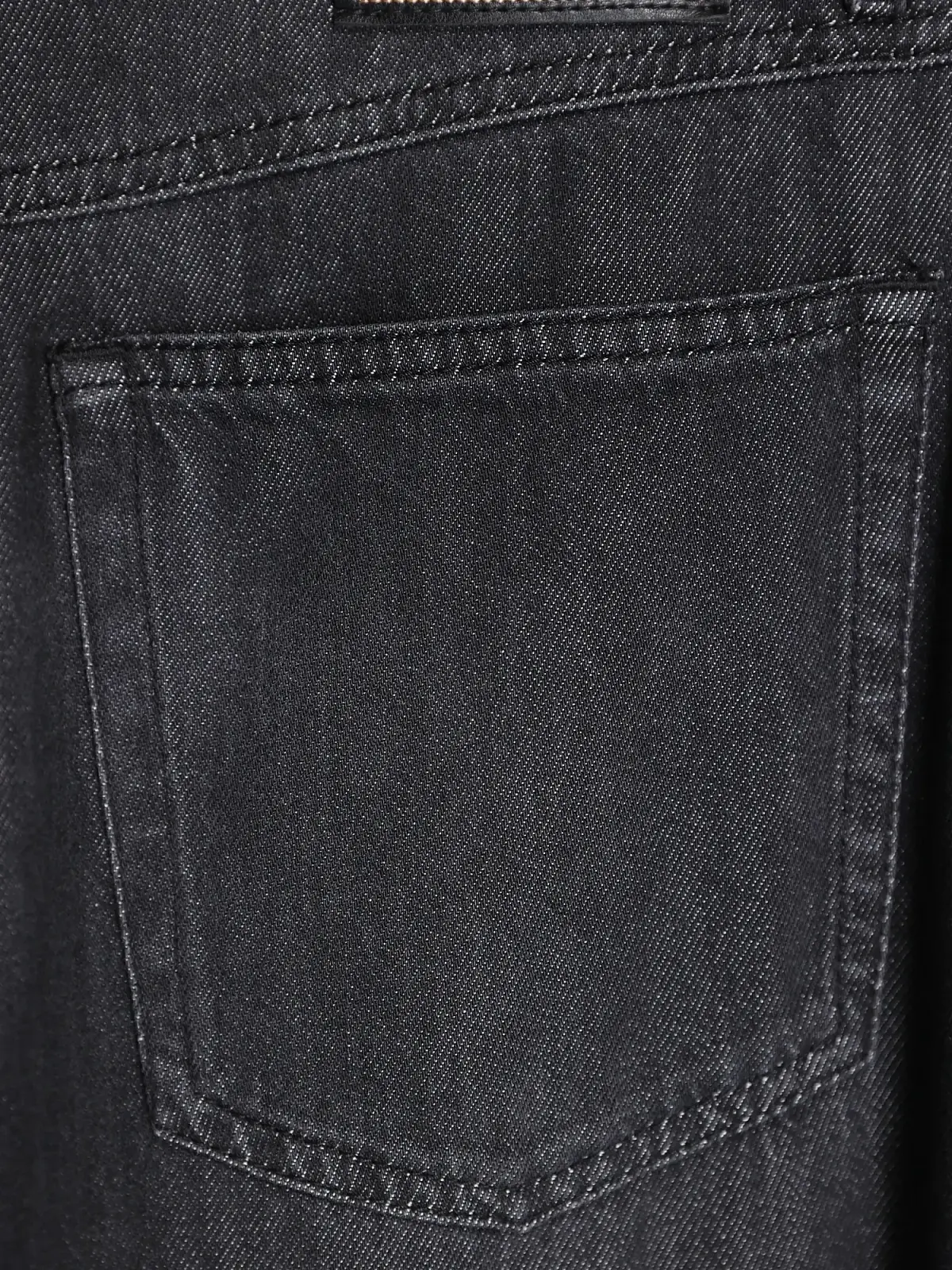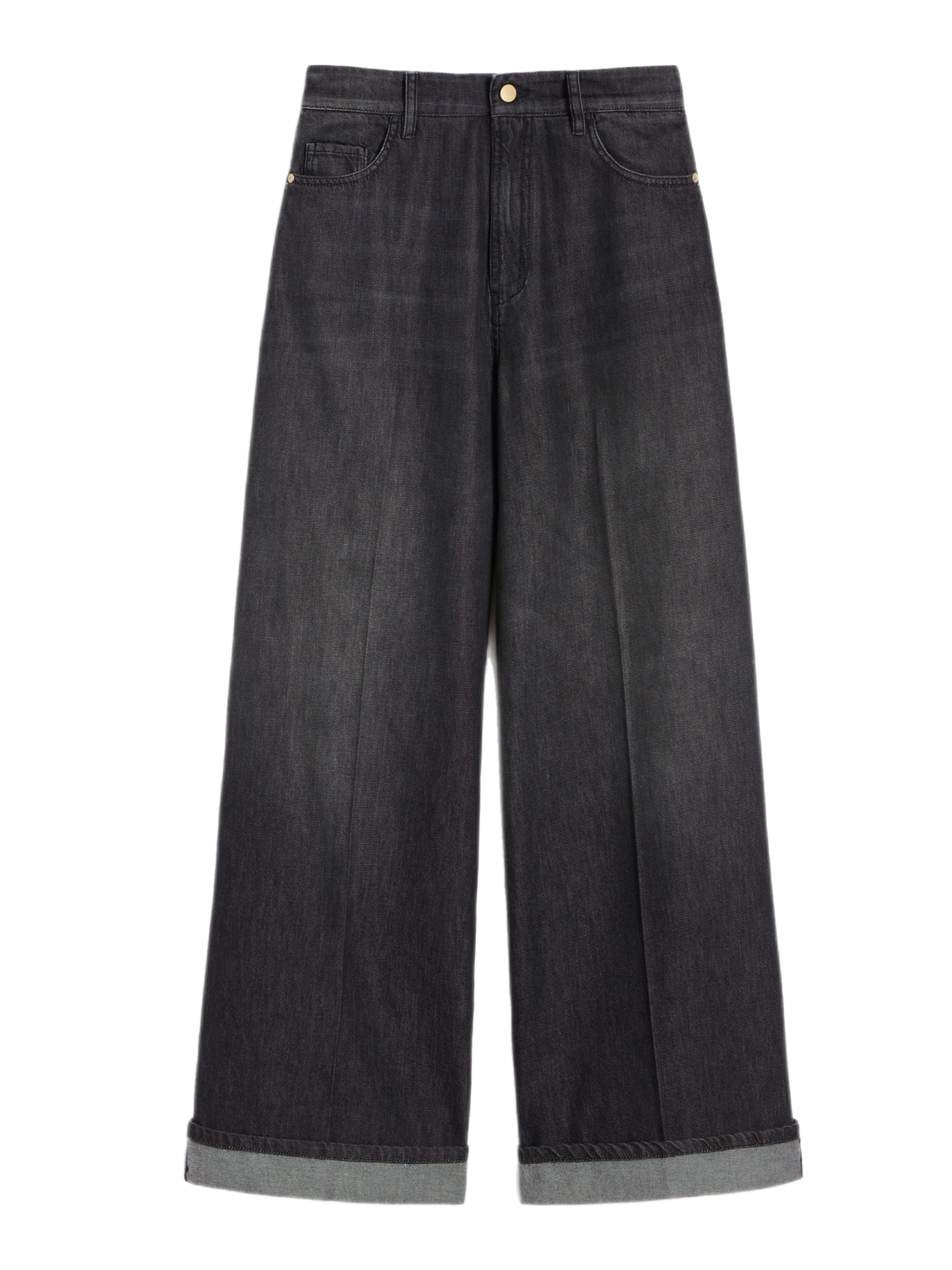 Джинсы Max Mara LUSSO черного цвета, выполненные из смеси хлопка и вискозы, обладают мягкой текстурой и легким блеском. Свободный крой с широкими штанинами подчеркивает современный стиль и комфорт. Минималистичная отделка с классическими карманами и металлической фурнитурой добавляет элегантности. Идеальный выбор для повседневного образа с акцентом на качество и детали.