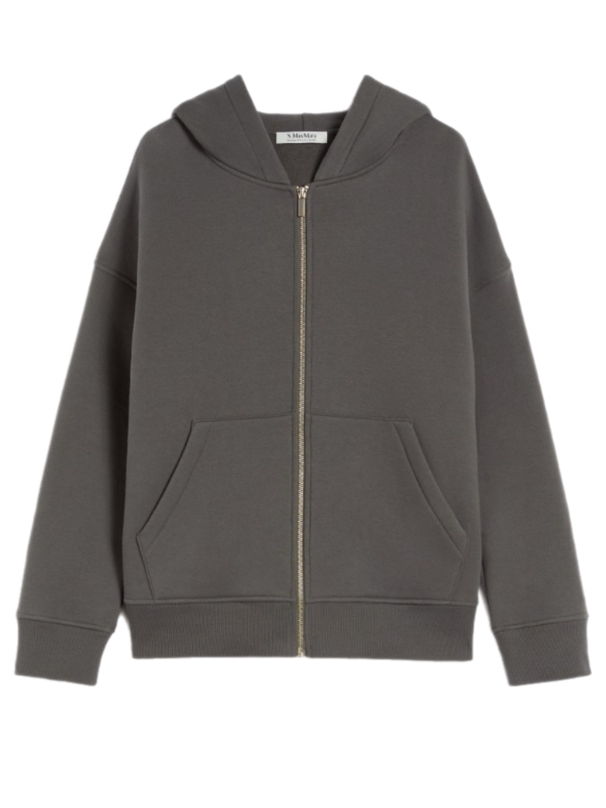 Толстовка спортивная Max Mara выполнена из мягкой смесовой ткани с добавлением эластана, обеспечивающей комфорт и эластичность. Темно-зеленый цвет придает модели элегантный и сдержанный вид. Классический крой с капюшоном и застежкой-молнией по центру дополнен двумя передними карманами. Простой и современный дизайн идеально подходит для повседневного стиля. В дополнении к худи идут брюки свободного кроя.