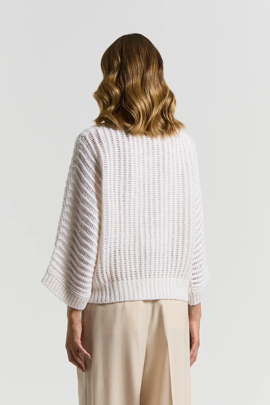 Свитер, который заставляет вас влюбиться с первого взгляда. Заниженное качество кроя кимоно соответствует отличительности сетчатого трикотажа с мокрым эффектом этого свободного и обволакивающего джемпера. Пряжа из шерсти альпаки имеет легкий глоск, что делает этот свитер особенным и чрезвычайно мягким.