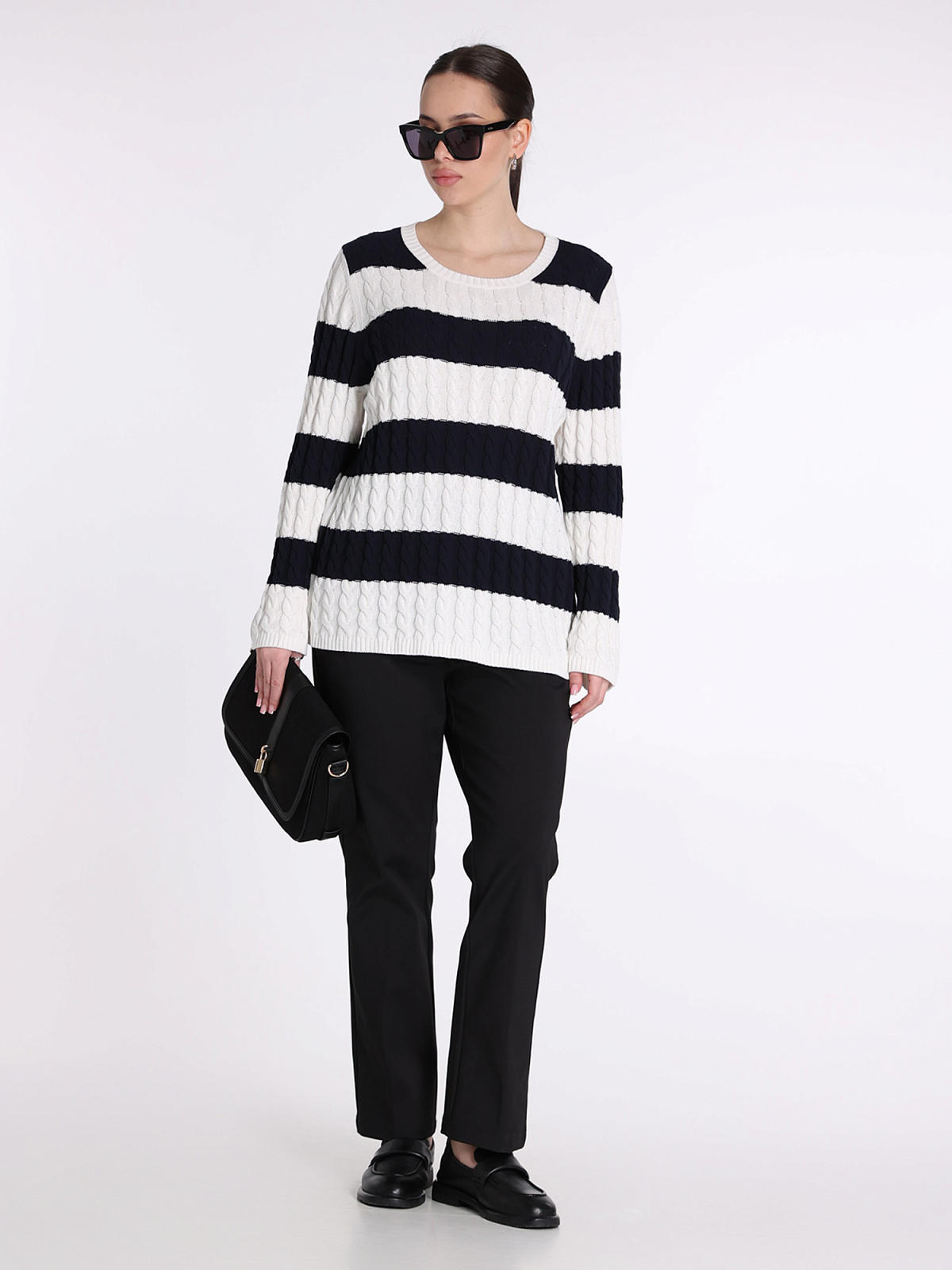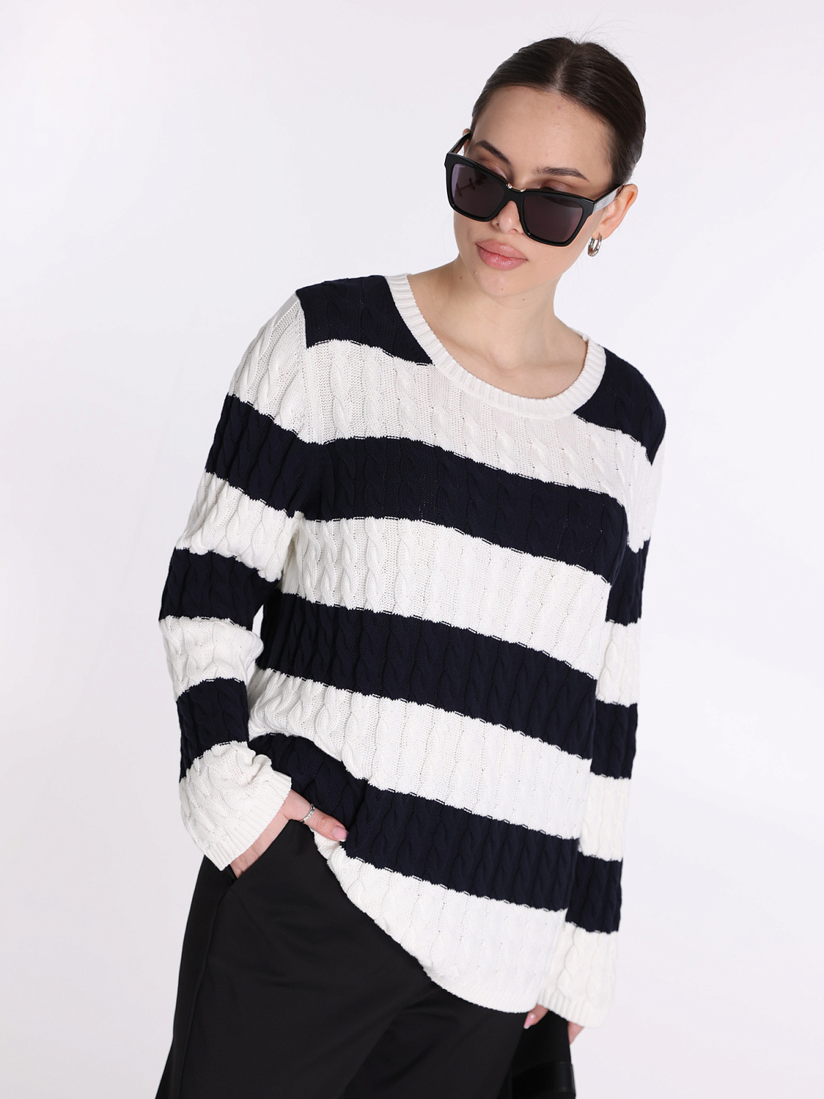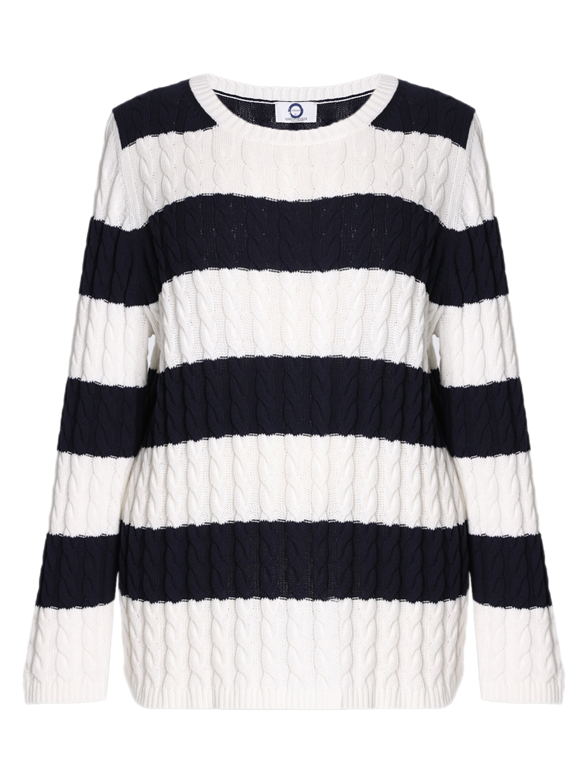 Джемпер Marina Rinaldi в темно-синем цвете, выполненный из 100% хлопка, сочетает в себе классический узор и современную текстуру. Сочетание широких горизонтальных полос с фактурной вязкой придает изделию элегантный и утонченный вид. Круглый вырез и прямой крой создают комфортный силуэт, идеально подходящий для повседневного стиля. Детали отделки подчеркивают качество и внимание к деталям, делая этот джемпер незаменимым элементом гардероба.