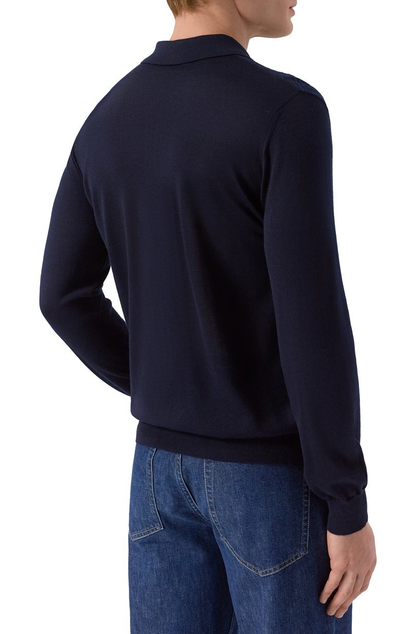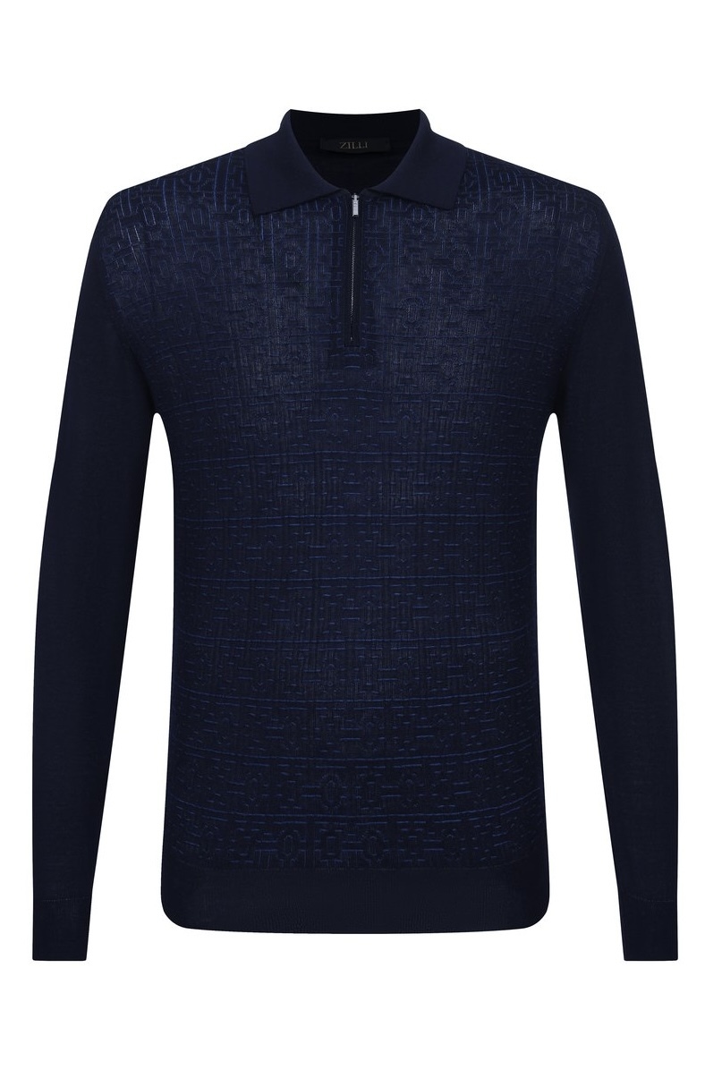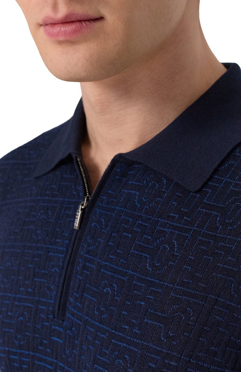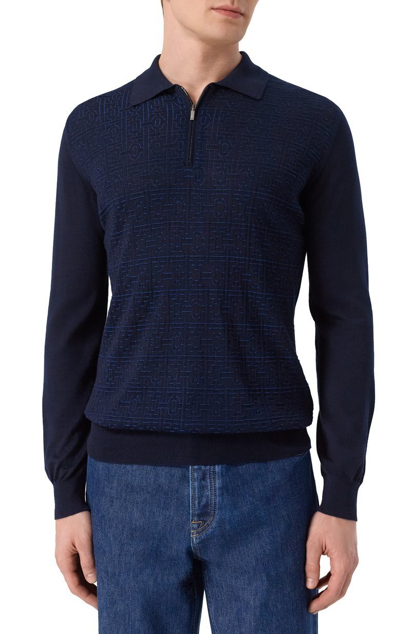 Поло с геометричным жаккардовым паттерном спереди сшили из трикотажа на основе кашемира и шелка. Модель застегивается короткой молнией с брендированным пуллером.