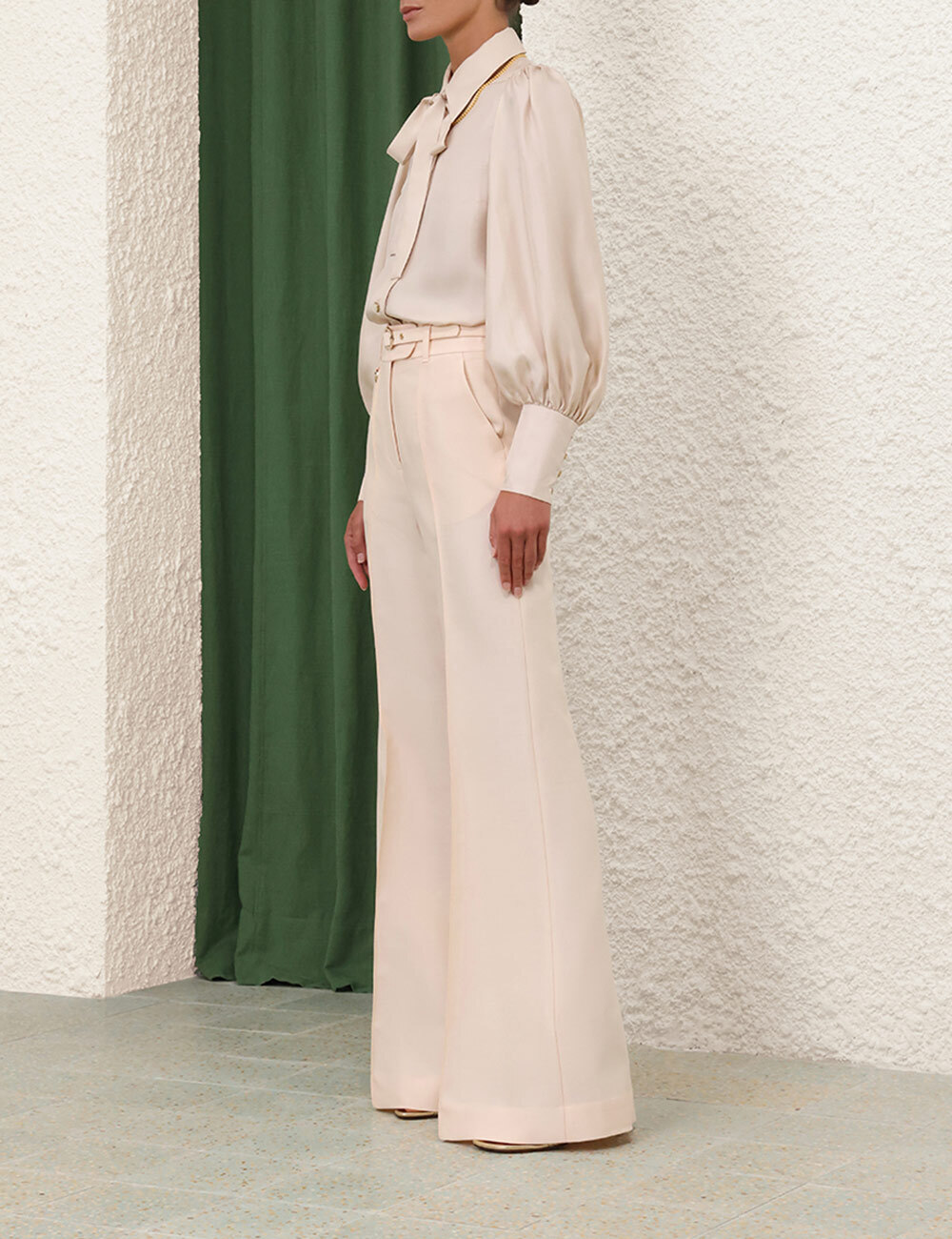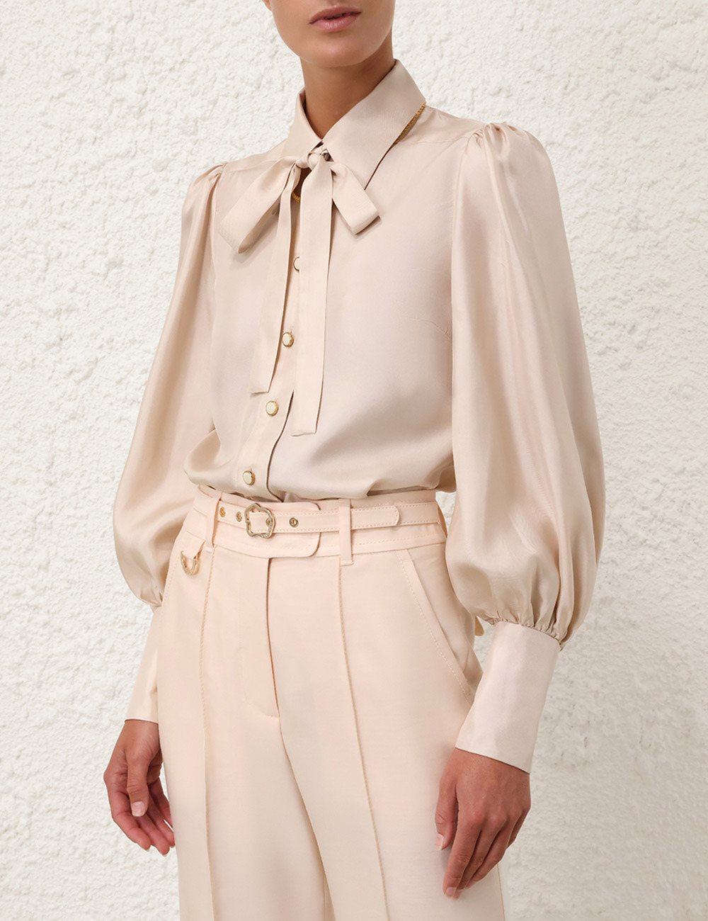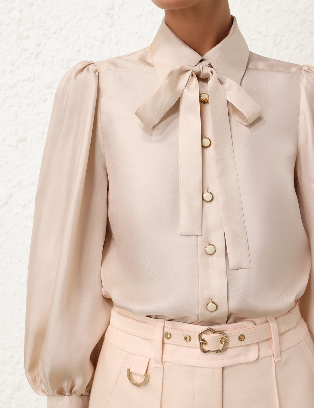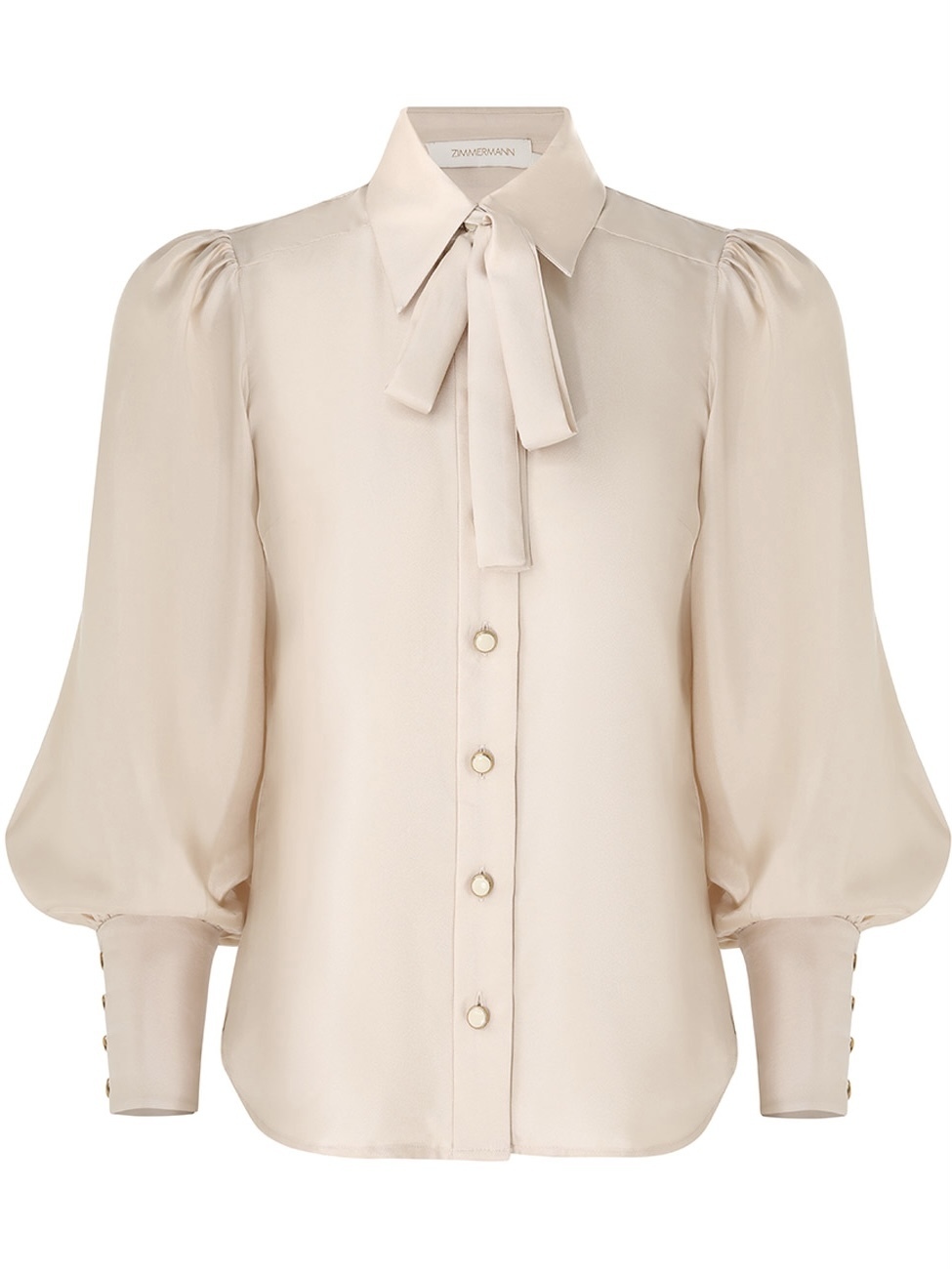 Рубашка Natura Blouson из жемчуга из нашей коллекции весна 2024 года, Natura. Шелковая рубашка с рукавом-блузоном, пуговицами посередине спереди и галстуком на шее.